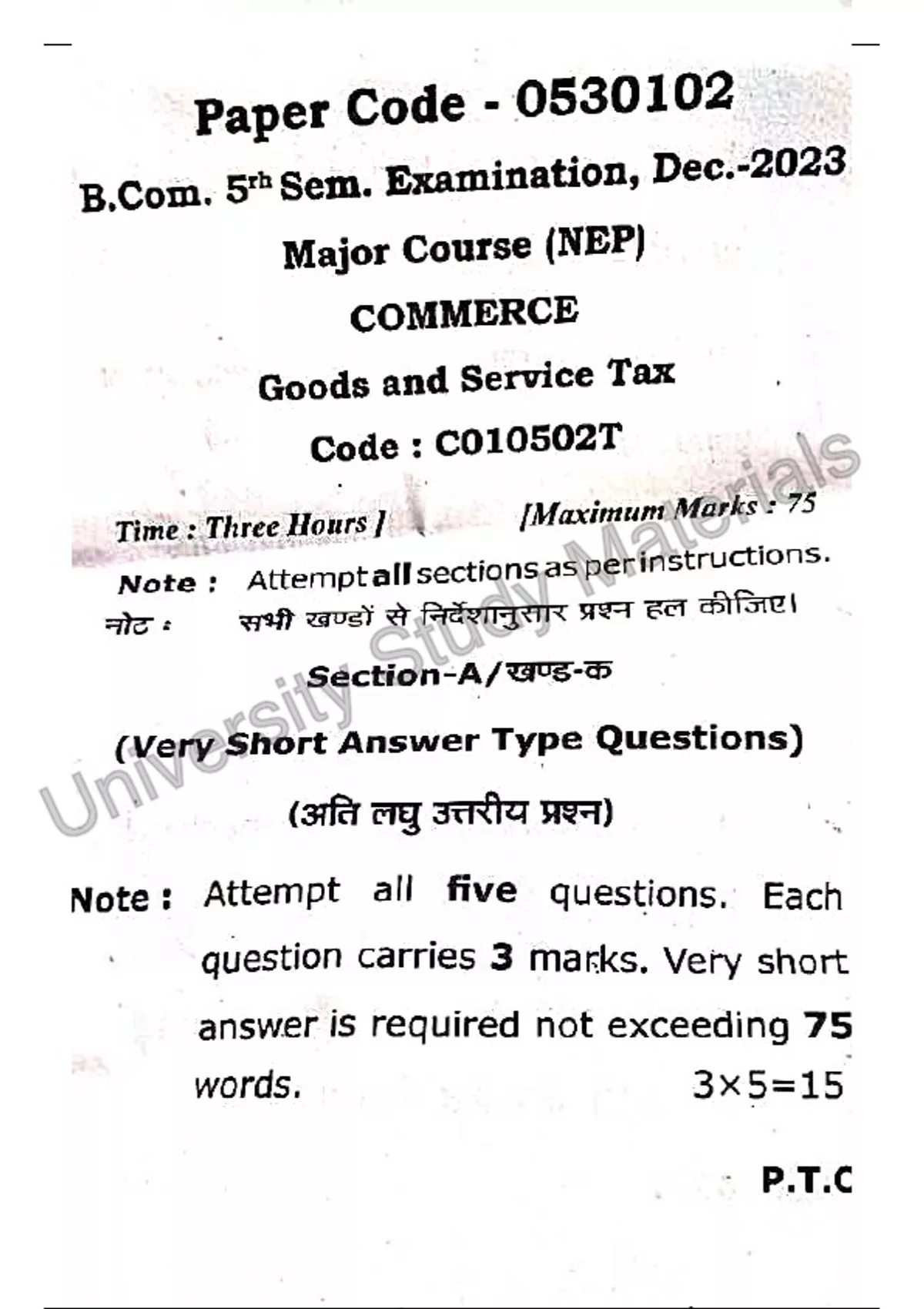 Previous year question paper for Goods and services tax exam of B.com 5th semester NEP best suitable for Chaudhary Charan Singh University and other U.P state universities.