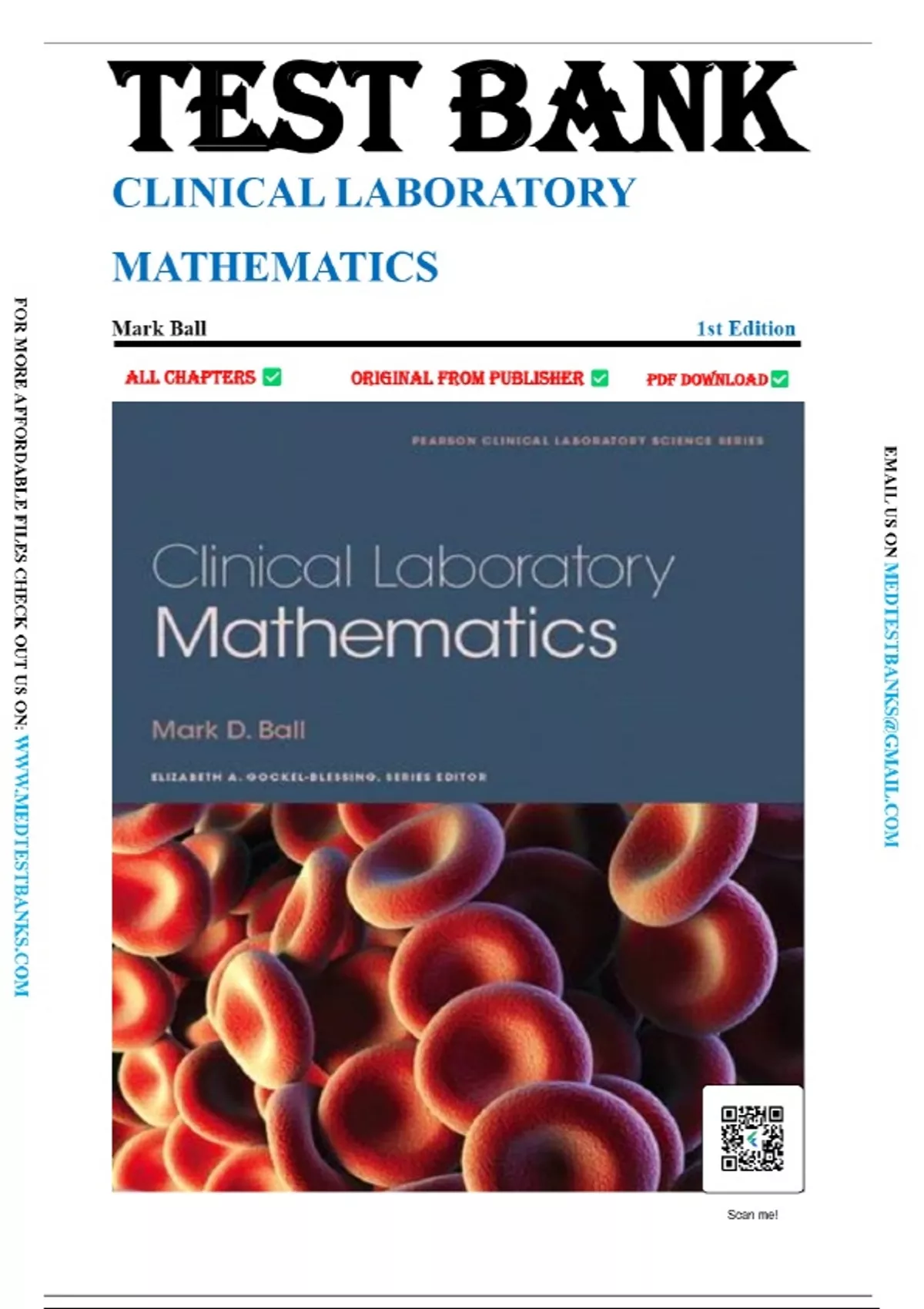 Test Bank For Clinical Laboratory Mathematics 1st Edition by Mark Ball (All Chapters 1-12). 1. Arithmetic and Algebra 2. Exponential Notation and Logarithms 3. Rounding and the Significance of Figures 4. Systems of Measurement 5. Solutions and Concentrations 6. Dilutions 7. Proportionality, Graphs, and Rates of Change 8. Statistics 9. Chemistry 10. Hematology 11. Quality Control 12. Method Evaluation