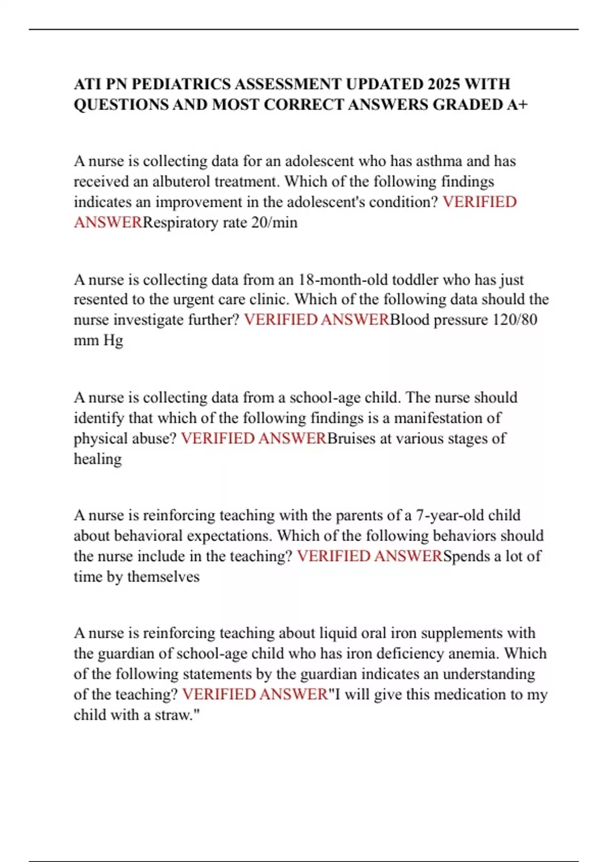ATI PN PEDIATRICS ASSESSMENT UPDATED 2025 WITH QUESTIONS AND MOST CORRECT ANSWERS GRADED A+