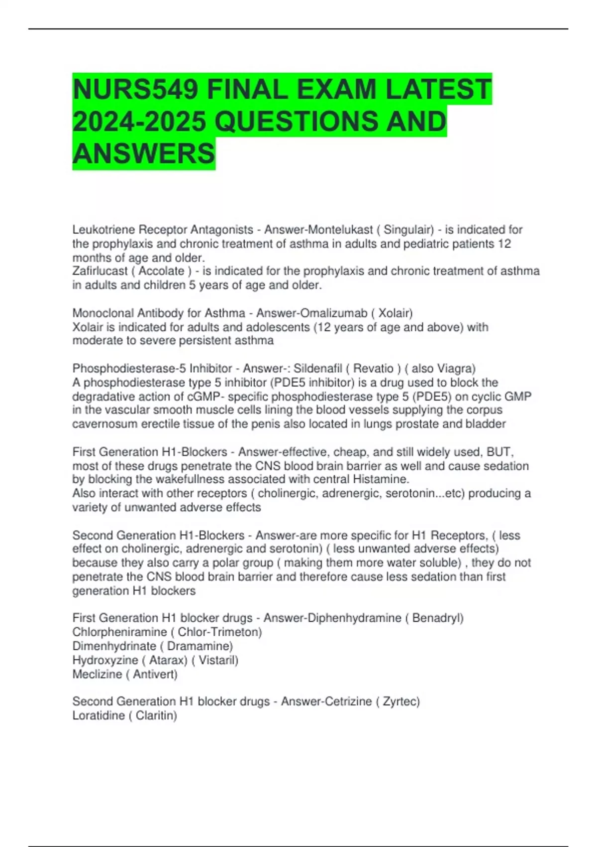 NURS549 FINAL EXAM LATEST QUESTIONS AND ANSWERS Leukotriene Receptor Antagonists - Answer-Montelukast ( Singulair) - is indicated for the prophylaxis and chronic treatment of asthma in adults and pediatric patients 12 months of age and older. Zafirlucast ( Accolate ) - is indicated for the prophylaxis and chronic treatment of asthma in adults and children 5 years of age and older. Monoclonal Antibody for Asthma - Answer-Omalizumab ( Xolair) Xolair is indicated for adults and adolescents (12 years of age and above) with moderate to severe persistent asthma Phosphodiesterase-5 Inhibitor - Answer-: Sildenafil ( Revatio ) ( also Viagra) A phosphodiesterase type 5 inhibitor (PDE5 inhibitor) is a drug used to block the degradative action of cGMP- specific phosphodiesterase type 5 (PDE5) on cyclic GMP in the vascular smooth muscle cells lining the blood vessels supplying the corpus cavernosum erectile tissue of the penis also located in lungs prostate and bladder First Generation H1-Blockers - Answer-effective, cheap, and still widely used, BUT, most of these drugs penetrate the CNS blood brain barrier as well and cause sedation by blocking the wakefullness associated with central Histamine. Also interact with other receptors ( cholinergic, adrenergic, serotonin...etc) producing a variety of unwanted adverse effects Second Generation H1-Blockers - Answer-are more specific for H1 Receptors, ( less effect on cholinergic, adrenergic and serotonin) ( less unwanted adverse effects) because they also carry a polar group ( making them more water soluble) , they do not penetrate the CNS blood brain barrier and therefore cause less sedation than first generation H1 blockers First Generation H1 blocker drugs - Answer-Diphenhydramine ( Benadryl) Chlorpheniramine ( Chlor-Trimeton) Dimenhydrinate ( Dramamine) Hydroxyzine ( Atarax) ( Vistaril) Meclizine ( Antivert) Second Generation H1 blocker drugs - Answer-Cetrizine ( Zyrtec) Loratidine ( Claritin) Fexofenadine ( Allegra) H-2 Receptor Antagonist Drugs - Answer-Cimetidine ( Tagamet) Ranitidine ( Zantac) Famotidine ( Pepcid) Nizatidine ( Axid ) Proton Pump Inhibitors - Answer-Omeprazole ( Prilosec)- also OTC Lansoprazole (Prevacid )-also OTC Pantoprazole ( Protonix) Esomeprazole ( Nexium ) Rabeprazole ( Aciphex) Phenothiazines - Answer-Prochlorperazine ( Compazine ) Controls nausea and vomiting by blocking DOPAMINE receptors found in the CTZ. This stops the CTZ from sending the messages to the Vomiting Center that would otherwise cause nausea and vomiting. 5HT3 Serotonin Receptor Blockers - Answer-Odansetron ( Zofran) Selectively blocks SEROTONIN receptors at the Chemoreceptor Trigger Zone from sending the messages to the Vomiting Center that would otherwise cause nausea and vomiting Substituted Benzamides - Answer-Metoclopramide ( Reglan antagonism of central and peripheral dopamine receptors Bisacodyl (Dulcolax) - Answer-stimulant laxative that acts on nerve fibers in the colon Senna (Sennosoids) (Ex-lax) - Answer-stimulant laxative Lactulose (Enulose) - Answer-osmotic laxative - oral doses reach the colon and are degraded by colonic bacteria into lactic, formic and acetic acids. This ultimately increases osmotic pressure, causing fluid accumulation, colon distension, soft stools and defecation.. Docusate Sodium ( Colace) - Answer-becomes emulsified with the stool producing softer feces and ease of passage. ( often takes days to become effective and are often used for prophylaxis rather than acute treatment ) Polyethylene Glycol ( PEG) ( Miralax) ( Go-Lytely) - Answer-an osmotic agent which causes water to be retained with the stool Lubiprostone (Amitiza) - Answer-chloride channel activator in the intestinal lumen to increase fluid secretions producing a chloride rich fluid secretion Naloxegol (Movantik) - Answer-antagonist of opioid binding at the mu-opioid receptor. When administered at the recommended dose levels, functions as a peripherally-acting mu-opioid receptor antagonist in tissues such as the gastrointestinal tract, thereby decreasing the constipating effects of opioids Phosphodiesterase ( PDE-5) Inhibitors - Answer-Sildenafil ( Viagra) Tadalafil ( Cialis) Vardenafil ( Levitra) Avanafil ( Stendra) which is the enzyme responsible for degradation of cGMP in the corpus cavernosum, and this leads to an extended arterial vascular smooth muscle relaxation and prolonged increase in penile blood flow Doxazocin ( Cardura) Terazocin ( Hytrin) - Answer-BOTH high blood pressure and the urinary retention associated with benign prostatic hyperplasia (BPH). Blocks both Alpha-1A & Alpha -1B receptors Prazocin ( Minipress) - Answer-IS MORE SPECIFIC FOR HTN ( ALPHA 1B RECEPTORS) Tamsulosin ( Flomax) - Answer-MORE SPECIFIC FOR THE PROSTATE ( ALPHA 1A RECEPTORS) Finasteride ( Proscar) Dutasteride ( Avoda) - Answer-5 - Alpha Reductase Inhibitors for BPH By reducing hyperactive 5-Alpha Reductase and reducing DHT, the prostate shrinks and urine flow increases ( DHT), an androgen that stimulates prostate growth Treatment of Anemia - Answer-Cyanocobalamin ( B12) Epoetin Alfa ( Epogen, Procrit) Folic Acid Iron Treatment of Neutropenia - Answer-Filgrastim ( Neupogen) Pegfilgrastim ( Neulasta) Treatment of Sickle Cell Anemia - Answer-Hydroxyurea ( Hydrea) Pentoxyfylline ( Trental Anemia causes - Answer-chronic blood loss bone marrow abnormalities increased hemolysis infections Malignancy endocrine deficiencies renal failure dietary deficiencies disease states Iron Deficient Anemia - Answer-major component of Hemoglobin within the RBC. Iron Deficiency Causes: Blood loss Lack of iron in the diet ( meat, eggs, leafy greens) Insufficient intake during periods of accelerated growth in children Heavy Menstruation Pregnancy An inability to absorb iron----- intestinal disease / disorder - celiac dx. Drug - Ferrous Sulfate corrects deficiency Folic Acid( Folate) ( Vitamin B9) Deficiency Anemia - Answer-Essential for the maturation of RBC'S are two vitamins: 1. B12 and Folic Acid. L