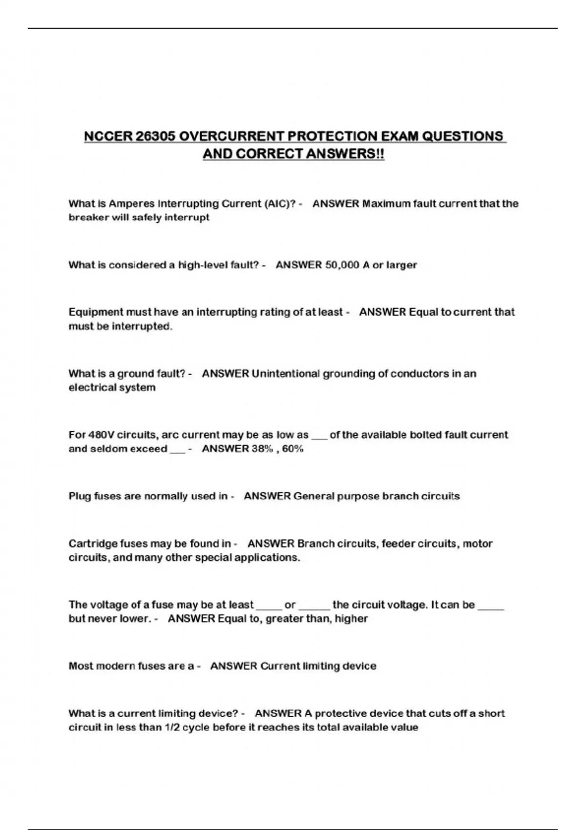 NCCER 26305 OVERCURRENT PROTECTION EXAM QUESTIONS AND CORRECT ANSWERS!!...