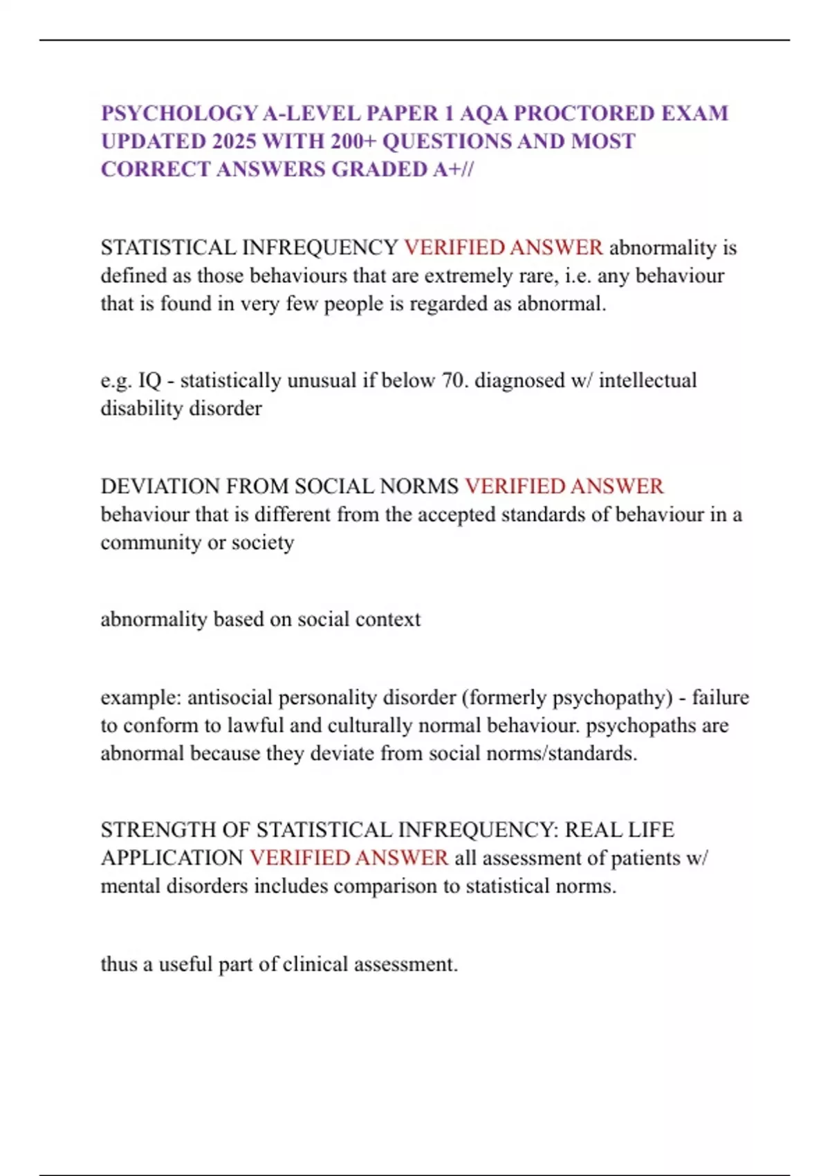 PSYCHOLOGY AQA A-LEVEL PAPER 1 EXAM UPDATED 2025 WITH 100+ QUESTIONS AND 100% CORRECT ANSWERS// GRADED A+