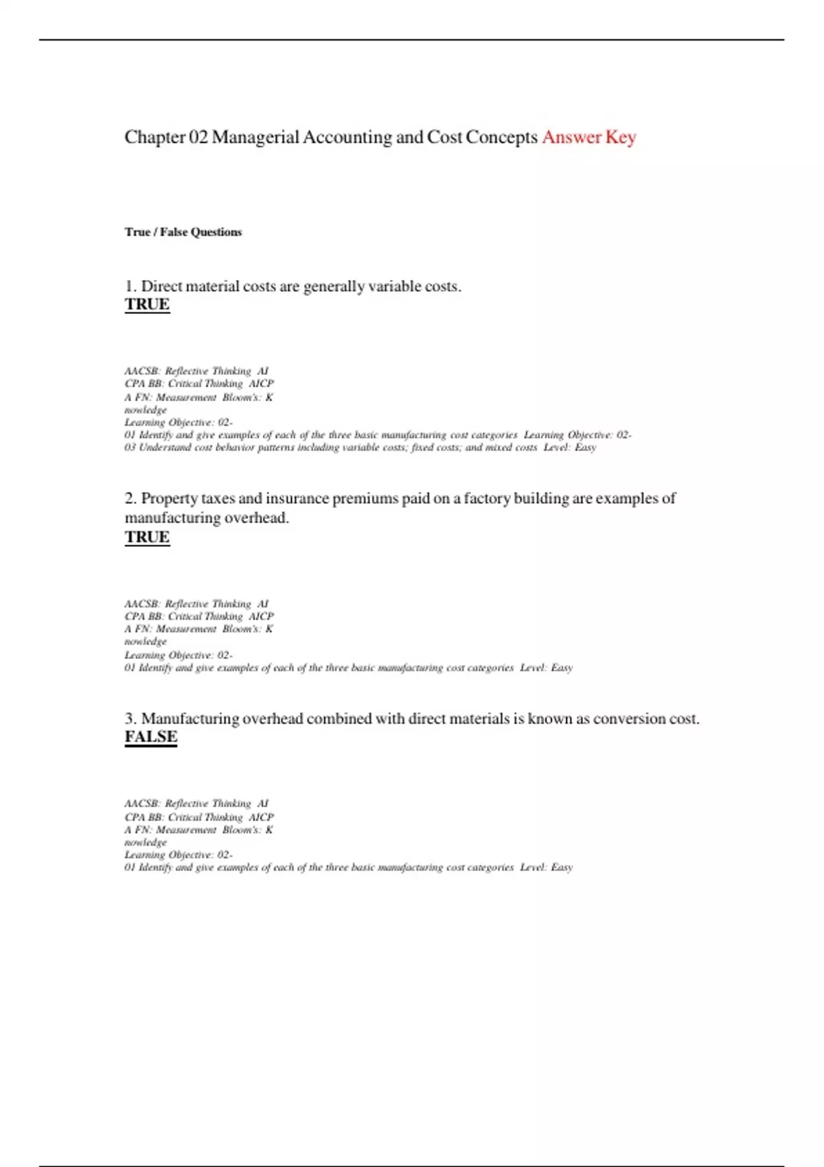 Chapter 02 Managerial Accounting and Cost Concepts Answer Key