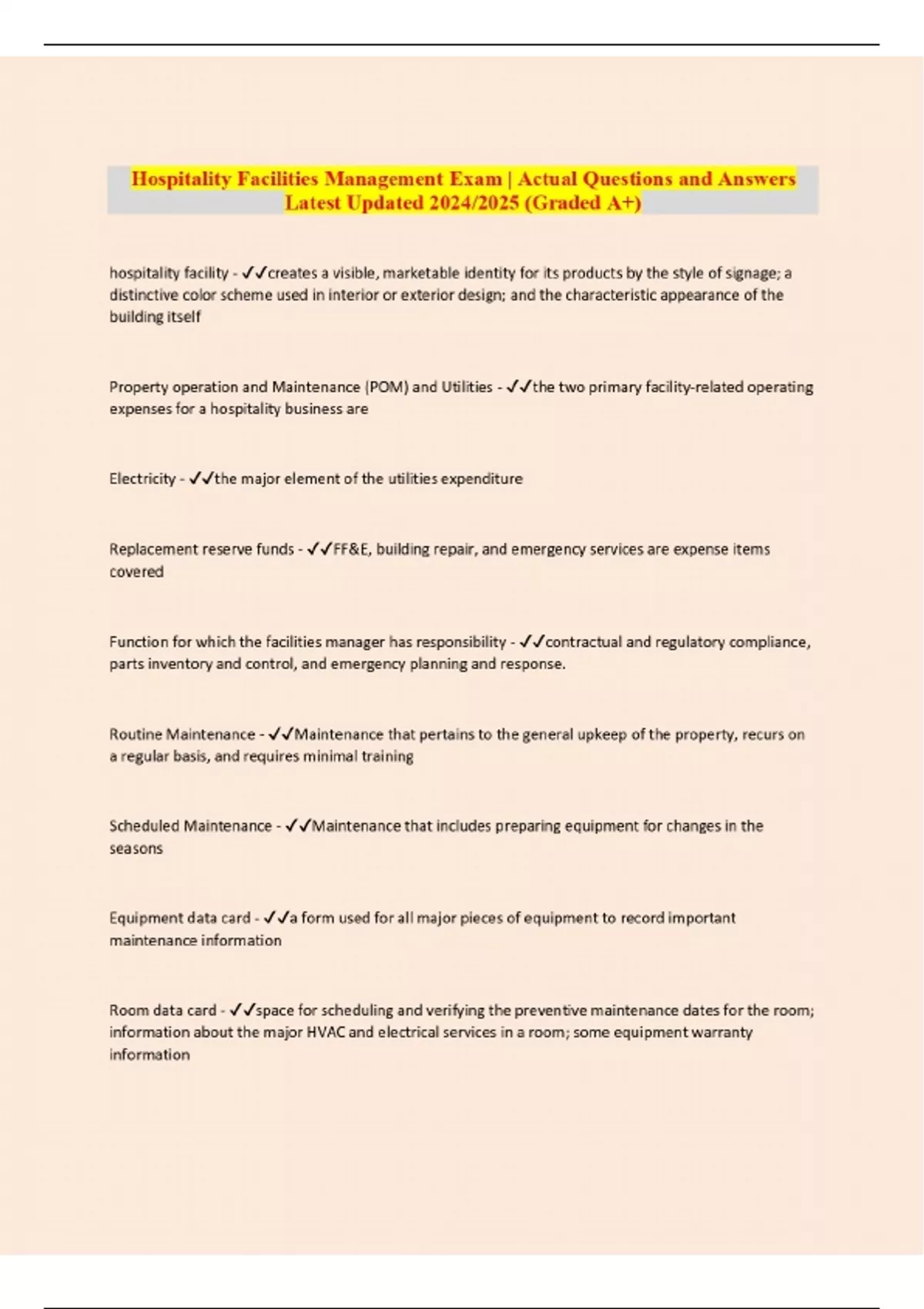 Hospitality Facilities Management Exam | Actual Questions and Answers Latest Updated 2024/2025 (Graded A+)