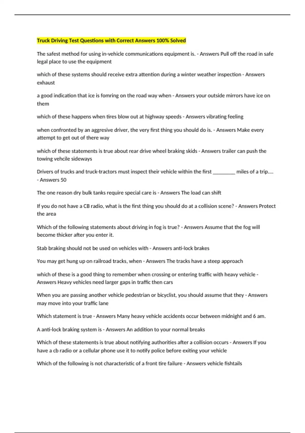 Truck Driving Test Questions with Correct Answers 100% Solved The safest method for using in-vehicle communications equipment is. - Answers Pull off the road in safe legal place to use the equipment which of these systems should receive extra attention during a winter weather inspection - Answers exhaust a good indication that ice is fomring on the road way when - Answers your outside mirrors have ice on them which of these happens when tires blow out at highway speeds - Answers vibrating feeling when confronted by an aggresive driver, the very first thing you should do is. - Answers Make every attempt to get out of there way which of these statements is true about rear drive wheel braking skids - Answers trailer can push the towing vehcile sideways Drivers of trucks and truck-tractors must inspect their vehicle within the first ________ miles of a trip.... - Answers 50 The one reason dry bulk tanks require special care is - Answers The load can shift If you do not have a CB radio, what is the first thing you should do at a collision scene? - Answers Protect the area Which of the following statements about driving in fog is true? - Answers Assume that the fog will become thicker after you enter it. Stab braking should not be used on vehicles with - Answers anti-lock brakes You may get hung up on railroad tracks, when - Answers The tracks have a steep approach which of these is a good thing to remember when crossing or entering traffic with heavy vehicle - Answers Heavy vehicles need larger gaps in traffic then cars When you are passing another vehicle pedestrian or bicyclist, you should assume that they - Answers may move into your traffic lane Which statement is true - Answers Many heavy vehicle accidents occur between midnight and 6 am. A anti-lock braking system is - Answers An addition to your normal breaks Which of these statements is true about notifying authorities after a collision occurs - Answers If you have a cb radio or a cellular phone use it to notify police before exiting your vehicle Which of the following is not characteristic of a front tire failure - Answers vehicle fishtails The amount of brake pressure you need to stop your vehicle depends on - Answers The vehicles speed on how quickly you want to stop it takes a typical tractor trailer at least ---- seconds to clear a single track railroad-highway grade crossing - Answers 14 seconds when driving on a snow-packed road you should reduce your speed by at least ---- - Answers 1/2 Which of these statements is true about an inspection of suspension components - Answers axle mounts should be checked where they are secured on the vehicle frame and axle in rear tire failure dual rear tires will - Answers usually prevent fishtail When confronted by an aggresive driver the first thing you should do is - Answers Make every attempt to get out of their way after starting the engine the - Answers Coolant temperature gauge should begin a gradual rise to normal. When do strong winds affect driving the most? - Answers When exiting tunnels having antilock brakes on only the tractor will - Answers Give you more control over the vehicle when braking drivers of trucks and truck tractors with cargo must check that the cargo is well secured within the first --- miles of a trip - Answers 50 miles of a trip escape ramps - Answers should be used by any driver who loses braking power on a vehicle. if the anti-lock braking system is not working you should - Answers drive normally, but get the system serviced soon. what should you do before driving in the mountains - Answers Know the escape ramp locations on your route When driving in cold weather, your tire tread should: - Answers provide enough traction to steer and push the vehicle through snow. Brake "fade" can be: - Answers caused by the brakes getting very hot you are checking your steering and exhaust systems in a pre-trip inspection. Which of these problems should be fixed before the vehicle is driven. - Answers steering play more than 10% (2 inches on a 20 inch wheel) Which of these statements is true about brakes - Answers Brakes absorb more heat to stop heavier vehicles. bridge formulas permit - Answers Less maximum axle weight for axles that are c