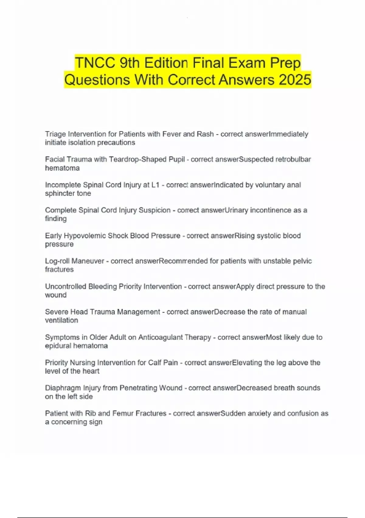 TNCC 9th Edition Final Exam Prep Questions With Correct Answers 2025