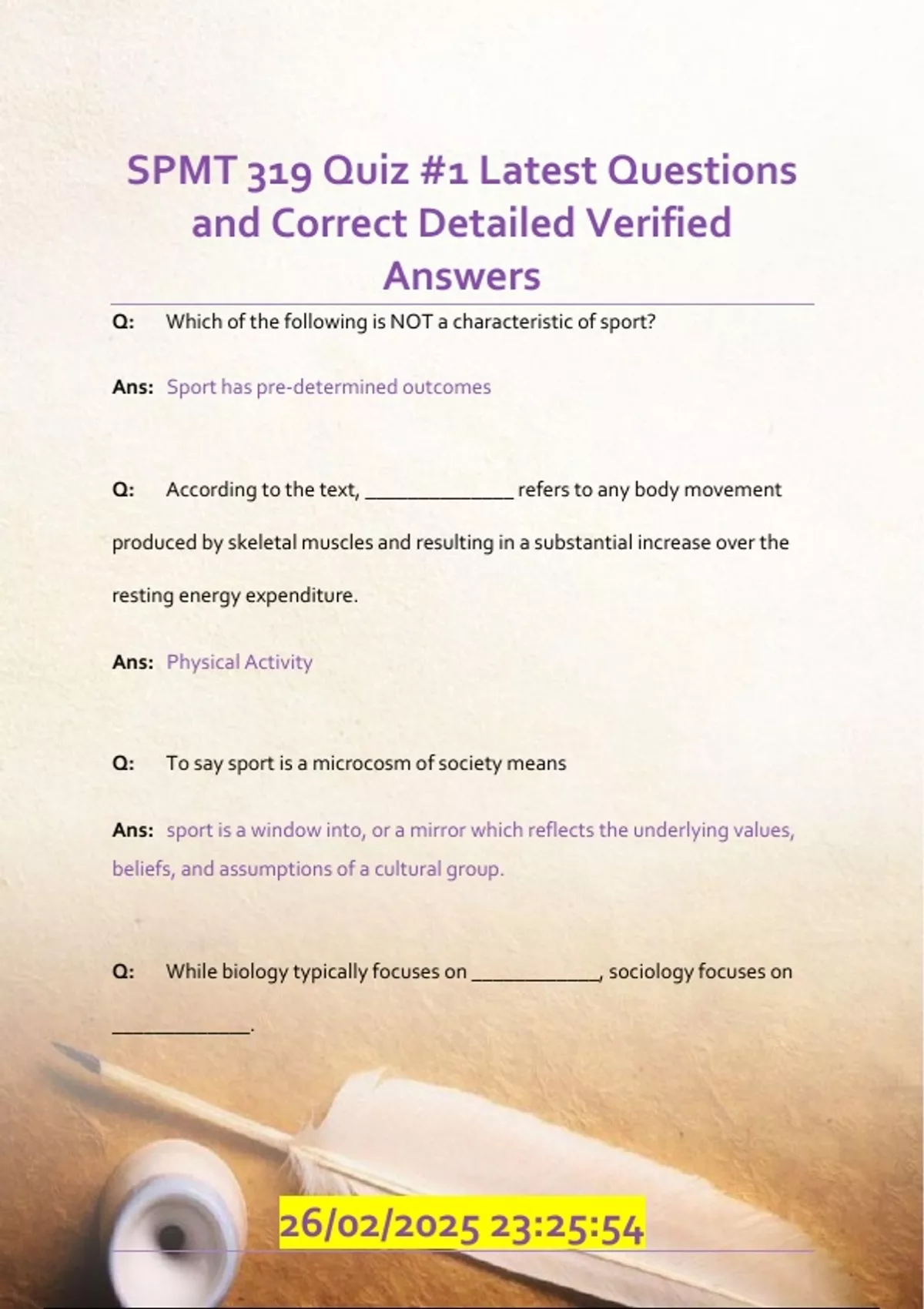 Q: Which of the following is NOT a characteristic of sport? Ans: Sport has pre-determined outcomes Q: According to the text, ______________ refers to any body movement produced by skeletal muscles and resulting in a substantial increase over the resting energy expenditure. Ans: Physical Activity Q: To say sport is a microcosm of society means Ans: sport is a window into, or a mirror which reflects the underlying values, beliefs, and assumptions of a cultural group. Q: While biology typically focuses on ____________, sociology focuses on _____________. 26/02/2025 23:25:54 Ans: factors internal to the individual, such as genetics; people and the the institutions they create and maintain Q: Sociologists hold that people are social beings by their very nature. Ans: True Q: Americans value the self-made person, or the individual who has achieved money and status through her or his effort in a highly competitive system such as sport. This is consistent with the value of: Ans: success Q: Within the sport context, the value of ___________ suggests that athletes should abide to what their coaches command. Ans: External Conformity