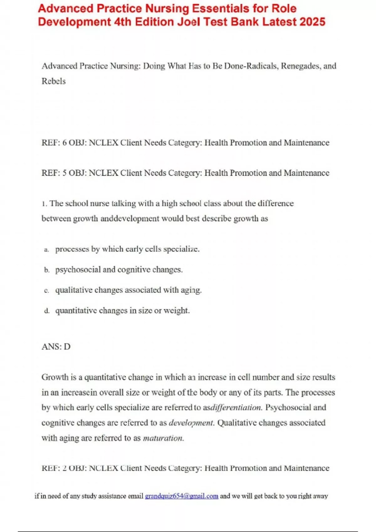 Advanced Practice Nursing Essentials for Role Development 4th Edition Joel Test Bank Latest 2025Advanced Practice Nursing Essentials for Role Development 4th Edition Joel Test Bank Latest 2025Advanced Practice Nursing Essentials for Role Development 4th Edition Joel Test Bank Latest 2025 Advanced Practice Nursing: Doing What Has to Be Done-Radicals, Renegades, and Rebels REF: 6 OBJ: NCLEX Client Needs Category: Health Promotion and Maintenance REF: 5 OBJ: NCLEX Client Needs Category: Health Promotion and Maintenance 1. The school nurse talking with a high school class about the difference between growth and development would best describe growth as a. processes by which early cells specialize. b. psychosocial and cognitive changes. c. qualitative changes associated with aging. d. quantitative changes in size or weight. ANS: D Growth is a quantitative change in which an increase in cell number and size results in an increase in overall size or weight of the body or any of its parts. The processes by which early cells specialize are referred to asdifferentiation. Psychosocial and cognitive changes are referred to as development. Qualitative changes associated with aging are referred to as maturation. REF: 2 OBJ: NCLEX Client Needs Category: Health Promotion and Maintenance 2. The most appropriate response of the nurse when a mother asks what the Denver II does is that it a. can diagnose developmental disabilities. b. identifies a need for physical therapy. c. is a developmental screening tool. d. provides a framework for health teaching. ANS: C The Denver II is the most commonly used measure of developmental status used by health care professionals; it is a screening tool. Screening tools do not provide a diagnosis. Diagnosis requires a thorough neurodevelopment history and physical examination. Developmental delay, which is suggested by screening, is a symptom, not a diagnosis. The need for any therapy would be identified with a comprehensive evaluation, not a screening tool. Some providers use the Denver II as a framework for teaching about expected development, but this is not the primary purpose of the tool. REF: 4 OBJ: NCLEX Client Needs Category: Health Promotion and Maintenance 3. To plan early intervention and care for an infant with Down syndrome, the nurse considers knowledge of other physical development exemplars such as a. cerebral palsy. b. failure to thrive. c. fetal alcohol syndrome. d. hydrocephaly. ANS: D Hydrocephaly is also a physical development exemplar. Cerebral palsy is an exemplar of adaptive developmental delay. Failure to thrive is an exemplar of social/emotional developmental delay. Fetal alcohol syndrome is an exemplar of cognitive developmental delay. REF: 9 OBJ: NCLEX Client Needs Category: Health Promotion and Maintenance 4. To plan early intervention and care for a child with a developmental delay, the nurse would consider knowledge of the concepts most significantly impacted by development, including a. culture. b. environment. c. functional status. d. nutrition. ANS: C Function is one of the concepts most significantly impacted by development. Others include sensory-perceptual, cognition, mobility, reproduction, and sexuality. Knowledge of these concepts can help the nurse anticipate areas that need to be addressed. Culture is a concept that is considered to significantly affect development; the difference is the concepts that affect development are those that represent major influencing factors (causes), hence determination of development and would be the focus of preventive interventions. Environment is considered to significantly affect development. Nutrition is considered to significantly affect development. REF: 1 OBJ: NCLEX Client Needs Category: Health Promotion and Maintenance 5. A mother complains to the nurse at the pediatric clinic that her 4-year-old child always talks to her toys and makes up stories. The mother wants her child to have a psychologic evaluation. The nurses best initial response is to a. refer the child to a psychologist. b. explain that playing make believe with dolls and people is normal at this age. c. complete a developmental screening. d. separate the child from the mother to get more information. ANS: B By the end of the fourth year, it is expected that a child will engage in fantasy, so this is normal at this age. A referral to a psychologist would be premature based only on the complaint of the mother. Completing a developmental screening would be very appropriate but not the initial response. The nurse would certainly want to get more information, but separating the child from the mother is not necessary at this time. REF: 5 OBJ: NCLEX Client Needs Category: Health Promotion and Maintenance 6. A 17-year-old girl is hospitalized for appendicitis, and her mother asks the nurse why she is so needy and acting like a child. The best response of the nurse is that in the hospital, adolescents a. have separation anxiety. b. rebel against rules. c. regress because of stress. d. want to know everything. ANS: C Regression to an earlier stage of development is a common response to stress. Separation anxiety is most common in infants and toddlers. Rebellion against hospital rules is usually not an issue if the adolescent understands the rules and would not create childlike behaviors. An adolescent may want to know everything with their logical thinking and deductive reasoning, but that would not explain why they would act like a child. Chapter 2. Emerging Roles of the Advanced Practice Nurse Test Bank Multiple Choice 1. An APRN is about to examine a patient in the emergency department. A colleague states to the APRN “This patient is probably just seeking pain medication.” Regardless of his or her colleague’s comment he or she enter the examination room and treat the patient as if he or she is trustworthy and has good motives. Which of the ten essential elements of dignity is the APRN utilizing?