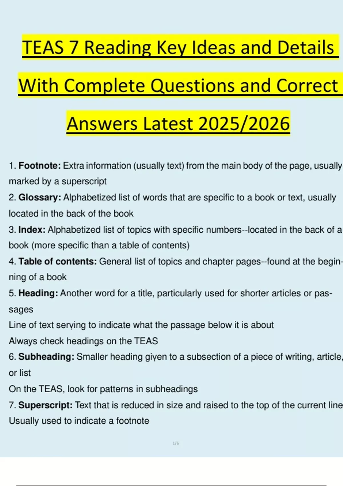 TEAS 7 Reading Key Ideas and Details With Complete Questions and Correct Answers Latest 2025/2026 1. ATI TEAS 7 study guide for nursing students 2025 2. Best practice questions for ATI TEAS 7 nursing exam 3. ATI TEAS 7 correct answers explained for nursing 4. How to score A+ on ATI TEAS 7 nursing test 2026 5. ATI TEAS 7 graded practice exams for nursing students 6. Latest ATI TEAS 7 question bank for nursing applicants 7. ATI TEAS 7 nursing exam preparation tips and tricks 8. Complete ATI TEAS 7 review materials for nursing school 9. ATI TEAS 7 nursing test changes for 2025/2026 10. ATI TEAS 7 math section practice for nursing students 11. ATI TEAS 7 reading comprehension strategies for nurses 12. ATI TEAS 7 science questions with detailed explanations 13. ATI TEAS 7 English language usage tips for nursing exam 14. ATI TEAS 7 time management techniques for test day 15. ATI TEAS 7 nursing exam format and structure explained 16. ATI TEAS 7 study schedule for working nursing students 17. ATI TEAS 7 practice tests with instant grading for nurses 18. ATI TEAS 7 exam updates and changes for nursing applicants 19. ATI TEAS 7 test-taking strategies for nursing students 20. ATI TEAS 7 anatomy and physiology review for nursing exam 21. ATI TEAS 7 chemistry concepts for nursing school entrance 22. ATI TEAS 7 biology questions commonly asked in nursing test 23. ATI TEAS 7 vocabulary list for nursing exam preparation 24. ATI TEAS 7 calculator usage tips for nursing math section 25. ATI TEAS 7 score interpretation guide for nursing applicants