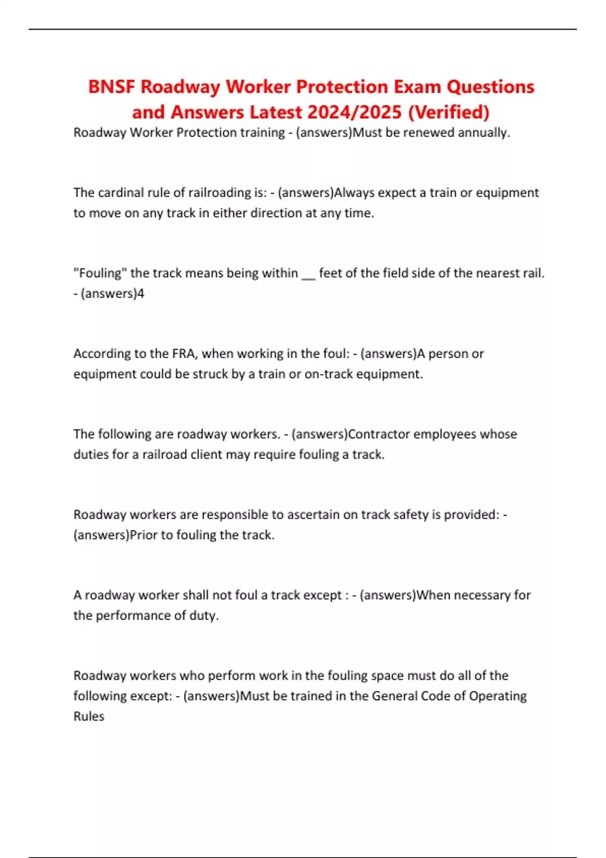 Roadway Worker Protection training - (answers)Must be renewed annually.