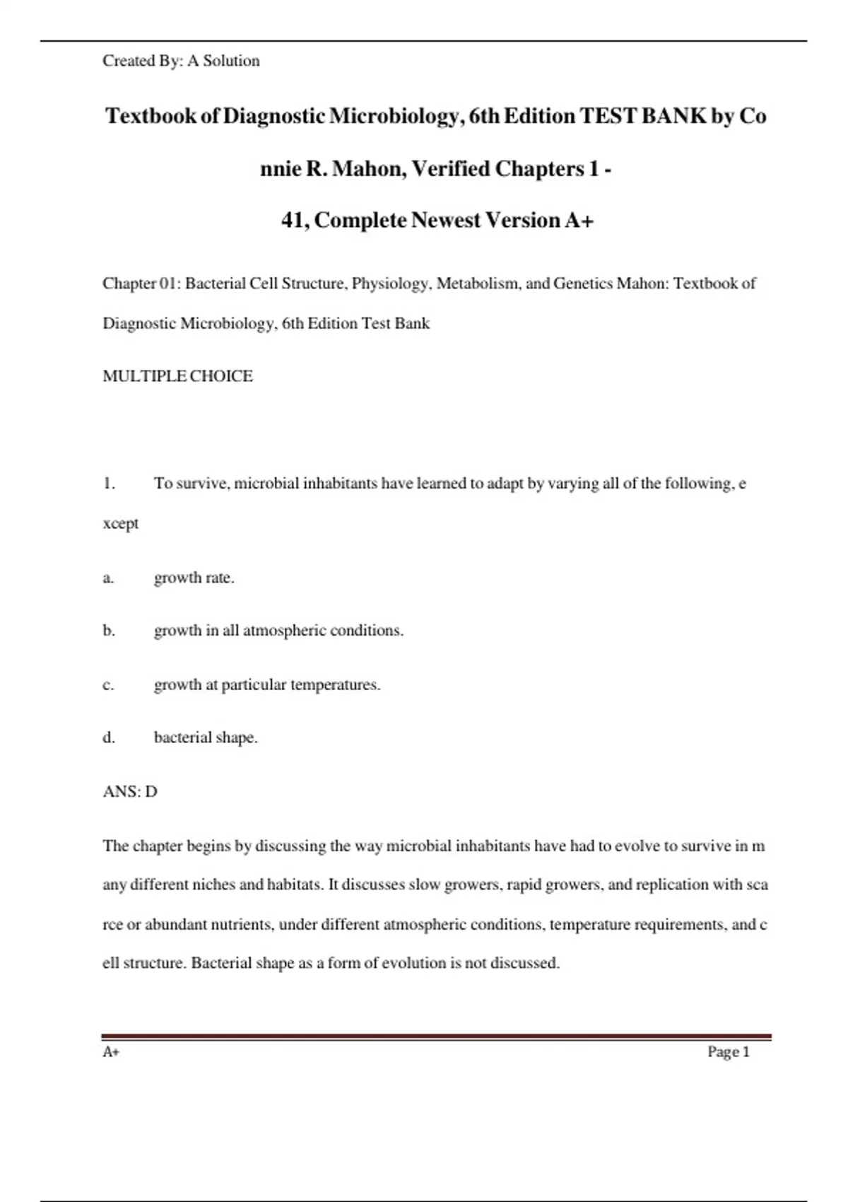 Test Bank- Textbook of Diagnostic Microbiology 6th Edition ( Mahon, 2019) Chapter 1-