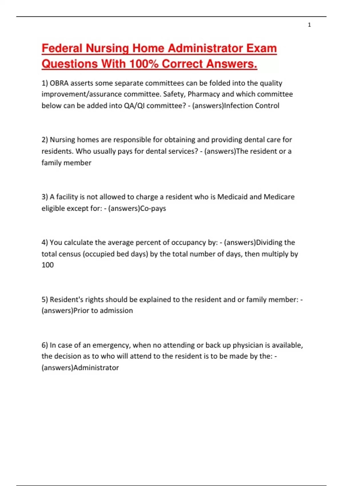 Federal Nursing Home Administrator Exam Questions With 100% Correct Answers.