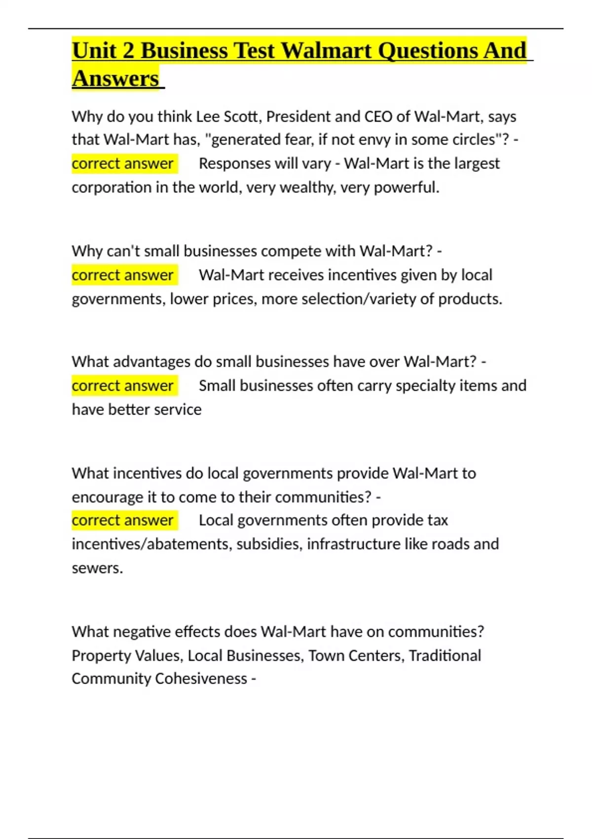 Unit 2 Business Test Walmart Questions And A
