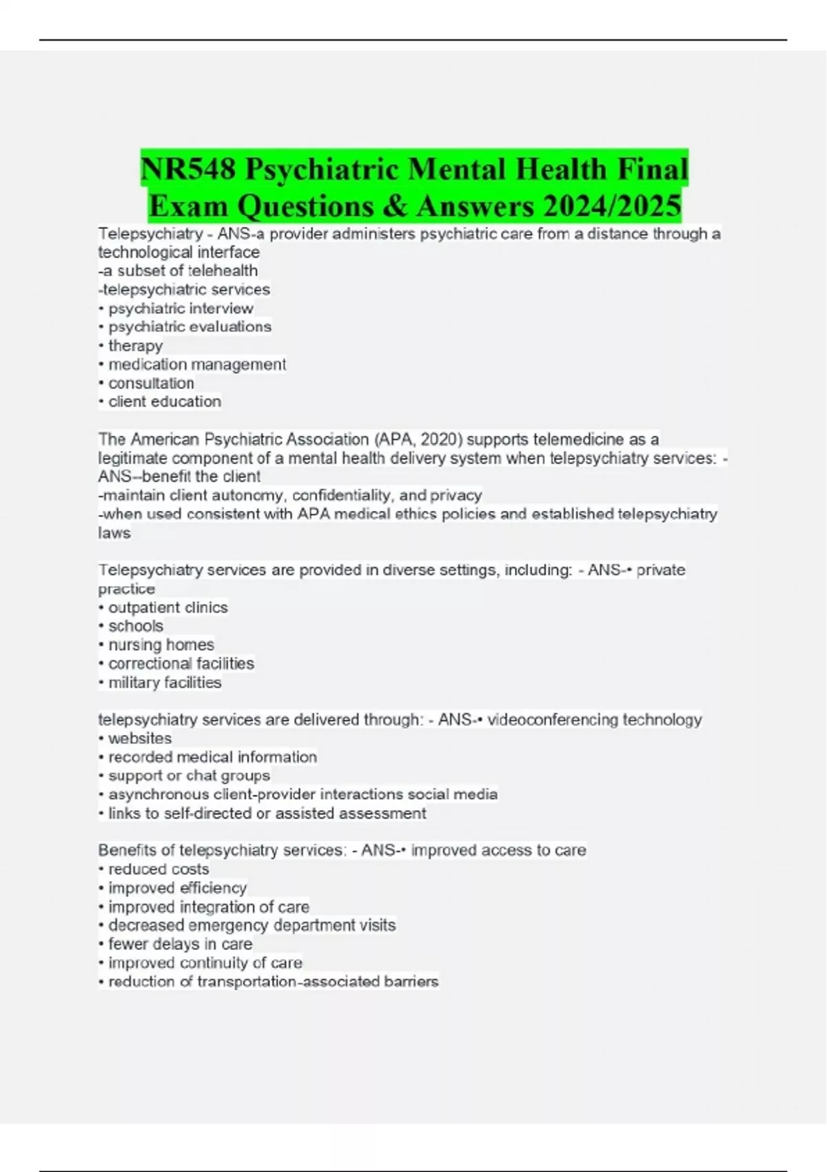 NR548 Psychiatric Mental Health Final Exam Questions & Answers 2024/2025 Telepsychiatry - ANS-a provider administers psychiatric care from a distance through a technological interface -a subset of telehealth -telepsychiatric services • psychiatric interview • psychiatric evaluations • therapy • medication management • consultation • client education The American Psychiatric Association (APA, 2020) supports telemedicine as a legitimate component of a mental health delivery system when telepsychiatry services: - ANS--benefit the client -maintain client autonomy, confidentiality, and privacy -when used consistent with APA medical ethics policies and established telepsychiatry laws Telepsychiatry services are provided in diverse settings, including: - ANS-• private practice • outpatient clinics • schools • nursing homes • correctional facilities • military facilities telepsychiatry services are delivered through: - ANS-• videoconferencing technology • websites • recorded medical information • support or chat groups • asynchronous client-provider interactions social media • links to self-directed or assisted assessment Benefits of telepsychiatry services: - ANS-• improved access to care • reduced costs • improved efficiency • improved integration of care • decreased emergency department visits • fewer delays in care • improved continuity of care • reduction of transportation-associated barriers Telepsychiatry __________, _________, _________, and _________ outcomes are comparable to in-person services. - ANS-validity, reliability, assessment, and treatment outcomes most common modalities for providing telepsychiatric services is via _______________________ - ANS-videoconferencing technology In 2018, the American Psychiatric Association (APA), in conjunction with the American Telemedicine Association (ATA) developed: - ANS-best practices for providing videoconferencing-based telepsychiatric care -guidelines inform the technical considerations and administrative requirements needed to provide these services best practices for providing videoconferencing-based telepsychiatric care: - ANS--Use of a designated technology platform. Telesessions should not be conducted using alternate platforms; however, an alternate plan, such as a telephone call, may be used in case of technology failure. -Provisions for the verification of confidential and secure client information. -Sufficient bandwidth to provide clear, appropriate video and audio quality. -Device compliance with Health Insurance Portability and Accountability Act of 1996 (HIPAA) and state requirements. During telepsychiatry sessions, both the provider and client locations should be treated as a ______________ - ANS-confidential space During telepsychiatry sessions, provisions must be taken to ensure: - ANS--the discussion cannot be overheard by other -adequate lighting and ambiance are provided that is appropriate to the session -place the camera so that the eyes and face of the participants are visible Telepsychiatry Legal and Regulatory Considerations: Best practices - ANS--Malpractice insurance -Licensure requirements -Federal and state prescribing guidelines -Reimbursement Telepsychiatry Legal and Regulatory Considerations: Malpractice insurance - ANS-Malpractice insurance is required and some policies require additional policies for telehealth. Continues...