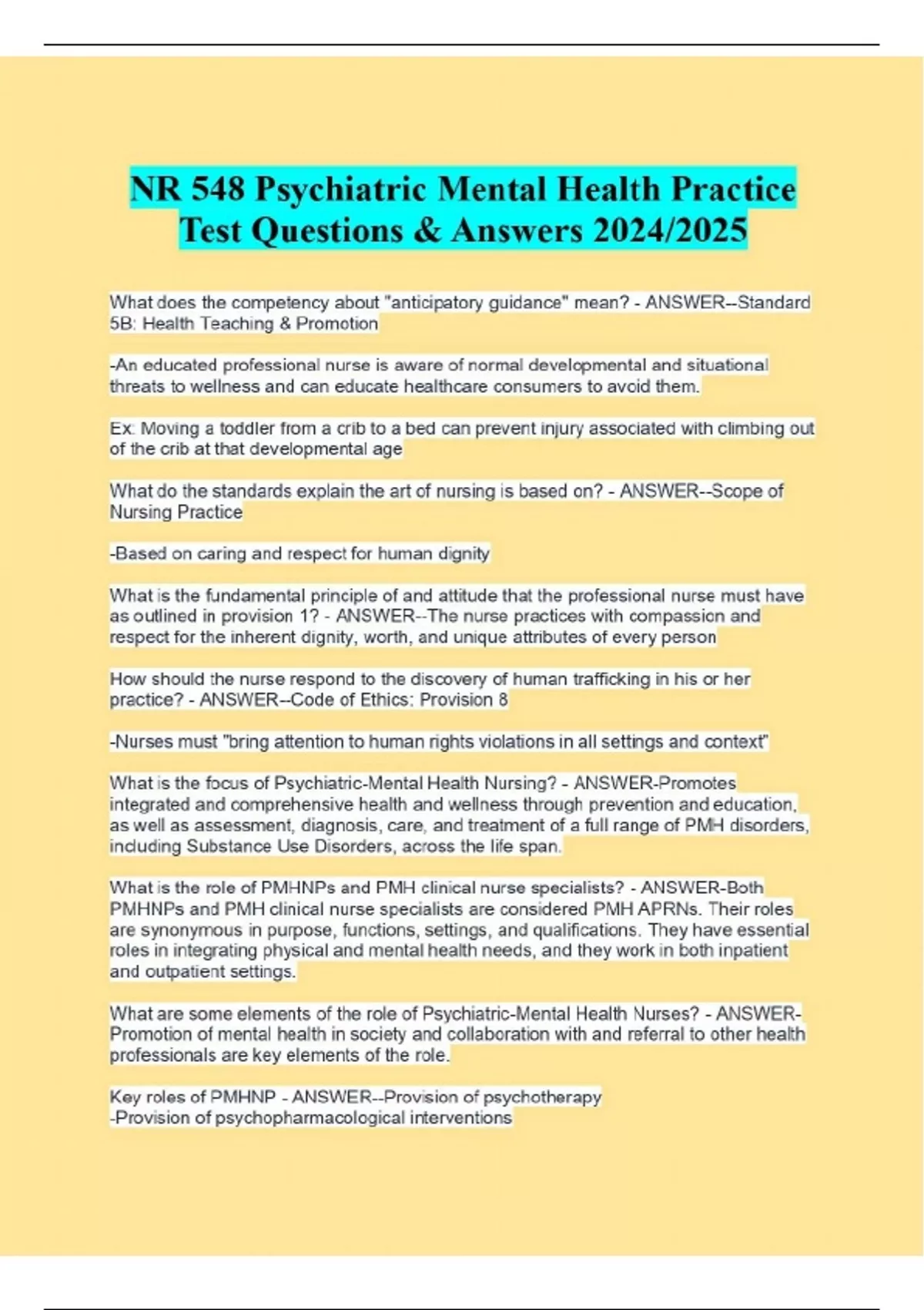 NR 548 Psychiatric Mental Health Practice Test Questions & Answers 2024/2025 What does the competency about "anticipatory guidance" mean? - ANSWER--Standard 5B: Health Teaching & Promotion -An educated professional nurse is aware of normal developmental and situational threats to wellness and can educate healthcare consumers to avoid them. Ex: Moving a toddler from a crib to a bed can prevent injury associated with climbing out of the crib at that developmental age What do the standards explain the art of nursing is based on? - ANSWER--Scope of Nursing Practice -Based on caring and respect for human dignity What is the fundamental principle of and attitude that the professional nurse must have as outlined in provision 1? - ANSWER--The nurse practices with compassion and respect for the inherent dignity, worth, and unique attributes of every person How should the nurse respond to the discovery of human trafficking in his or her practice? - ANSWER--Code of Ethics: Provision 8 -Nurses must "bring attention to human rights violations in all settings and context" What is the focus of Psychiatric-Mental Health Nursing? - ANSWER-Promotes integrated and comprehensive health and wellness through prevention and education, as well as assessment, diagnosis, care, and treatment of a full range of PMH disorders, including Substance Use Disorders, across the life span. What is the role of PMHNPs and PMH clinical nurse specialists? - ANSWER-Both PMHNPs and PMH clinical nurse specialists are considered PMH APRNs. Their roles are synonymous in purpose, functions, settings, and qualifications. They have essential roles in integrating physical and mental health needs, and they work in both inpatient and outpatient settings. What are some elements of the role of Psychiatric-Mental Health Nurses? - ANSWER-Promotion of mental health in society and collaboration with and referral to other health professionals are key elements of the role. Key roles of PMHNP - ANSWER--Provision of psychotherapy -Provision of psychopharmacological interventions -Provision of clinical supervision Consensus Model for APRN Regulation - ANSWER--Provides recommendations for licensure, accreditation, certification, and education pertaining to all APRN practice -PMHNP certification exam criteria set by ANCC What are some consequences of mental illness according to ODPHP? - ANSWER-neuropsychiatric disorders are among the leading causes of disability, disease burden, premature mortality, and suicide worldwide. How do mental health disorders impact individuals, families, and society? - ANSWER-Mental health disorders impose a significant burden on individuals, families, and society. What percentage of adults with mental illness receive treatment? - ANSWER-Only 10.3% of adults with mental illness receive treatment. What is recognized as a need by mental health professionals for the mental health system? - ANSWER-Mental health professionals recognize the need for a recovery-oriented mental health system. What role can PMHNPs play in advocating for change in mental health? - ANSWER-PMHNPs may serve as leaders in their organization and community to advocate for change in mental health. ...