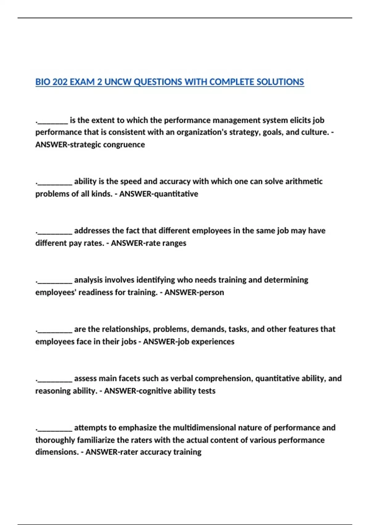 BIO 202 EXAM 2 UNCW QUESTIONS WITH COMPLETE SOLUTIONS ._______ is the extent to which the performance management system elicits job performance that is consistent with an organization's strategy, goals, and culture. - ANSWER-strategic congruence .________ ability is the speed and accuracy with which one can solve arithmetic problems of all kinds. - ANSWER-quantitative .________ addresses the fact that different employees in the same job may have different pay rates. - ANSWER-rate ranges .________ analysis involves identifying who needs training and determining employees' readiness for training. - ANSWER-person .________ are the relationships, problems, demands, tasks, and other features that employees face in their jobs - ANSWER-job experiences .________ assess main facets such as verbal comprehension, quantitative ability, and reasoning ability. - ANSWER-cognitive ability tests .________ attempts to emphasize the multidimensional nature of performance and thoroughly familiarize the raters with the actual content of various performance dimensions. - ANSWER-rater accuracy training .________ benefits involve the highest costs. - ANSWER-medical and other insurance .________ forecast and monitor the proportion of various protected group members, such as women and minorities, that are in various job categories and career tracks - ANSWER-affrimative action plans .________ is a planned effort to facilitate the learning of job-related knowledge, skills, and behavior by employees. - ANSWER-training .________ is a procedure in which an organization compares its own practices against those of the competition. - ANSWER-benchmarking .________ is a systematic, planned strategic effort by a company to attract, retain, develop, and motivate highly skilled employees and managers. - ANSWER-talent management .________ is a wide variety of specific selection programs that employ multiple selection methods to rate either applicants or job incumbents on their managerial potential. - ANSWER-Assessment center .________ is an interpersonal relationship that is used to develop employees. - ANSWER-mentoring .________ is on-the-job use of knowledge, skills, and behaviors learned in training. - ANSWER-transfer of training .________ is similar to pay structures based on individual characteristics such as skill or knowledge, but usually refers to a plan that covers exempt employees. - ANSWER-competency-based pay .________ is the degree to which a measure is free from random error. - ANSWER-reliability .________ is the planned elimination of large numbers of personnel designed to enhance organizational effectiveness. - ANSWER-downsizing .________ is the practice or activity carried on by an organization with the primary purpose of identifying and attracting potential employees. - ANSWER-human resource recruitment .________ is the process of identifying the knowledge, skills, jobs, and behaviors that need to be emphasized in training. - ANSWER-task analysis .________ maximize(s) the fit between the company's social system (employees) and its technical system. - ANSWER-High performance work systems .________ plans permit employees to defer compensation on a pretax basis. - ANSWER-section 401(k) .________ provides a longitudinal overview of the dynamic relationships by which inputs are converted into outputs. - ANSWER-work-flow design .________ refers to the policies, practices, and systems that influence employees' behavior, attitudes, and performance - ANSWER-HR management .A ________ system is composed of compensable factors and a weighting scheme based on the importance of each compensable factor to the organization. - ANSWER-job evaluation .A company where employees constantly assimilate knowledge through monitoring the environment, making decisions, and flexibly restructuring the company to compete in that environment is known as a ________ organization. - ANSWER-learning .A competent employee receives lower-than-deserved ratings because of a few outstanding colleagues who set very high performance standards. This is an example of a ________ rater error. - ANSWER-contrast .A performance measure is said to be contaminated when - ANSWER-it evaluates irrelevent aspects of performance .A restaurant in mid-town New York City has instituted a policy to hire individuals living in close proximity to the restaurant to reduce instances of employees coming in late. As the area surrounding the hotel is predominantly populated with individuals of Caucasian origin, the Hispanic and African-American communities became underrepresented in the restaurant's workforce. This is an example of - ANSWER-disparate impact .A situation in which evaluators purposefully distort a rating to achieve personal or company goals is referred to as - ANSWER-appraisal politics .A telecom company assesses its developers more on their client support skills than their development skills. Which of the following would best describe the telecom company's performance management process? - ANSWER-contaminated .A work-study training method that uses both on-the-job training and classroom training is called - ANSWER-apprenticeship .A(n) ________ is a simulation of the administrative tasks of a manager's job. - ANSWER-in-basket .A(n) ________ is a simulation of the administrative tasks of a manager's job. - ANSWER-the myers-briggs type indicator .A(n) ________ is a story of how a firm will create value for customers and how it will do so profitably. - ANSWER-business model .A(n) ________ shows the proportion of employees in different job categories at different times. - ANSWER-transitional matrix .A(n) ________ test attempts to simulate the job in a prehiring context to observe how the applicant performs in the simulated job. - ANSWER-work-sample .According to emerging changes in the employment relationship, which of the following benefits do employees typically not expect to be provided by employers? - ANSWER-job security .According to the ________, a person (p)
