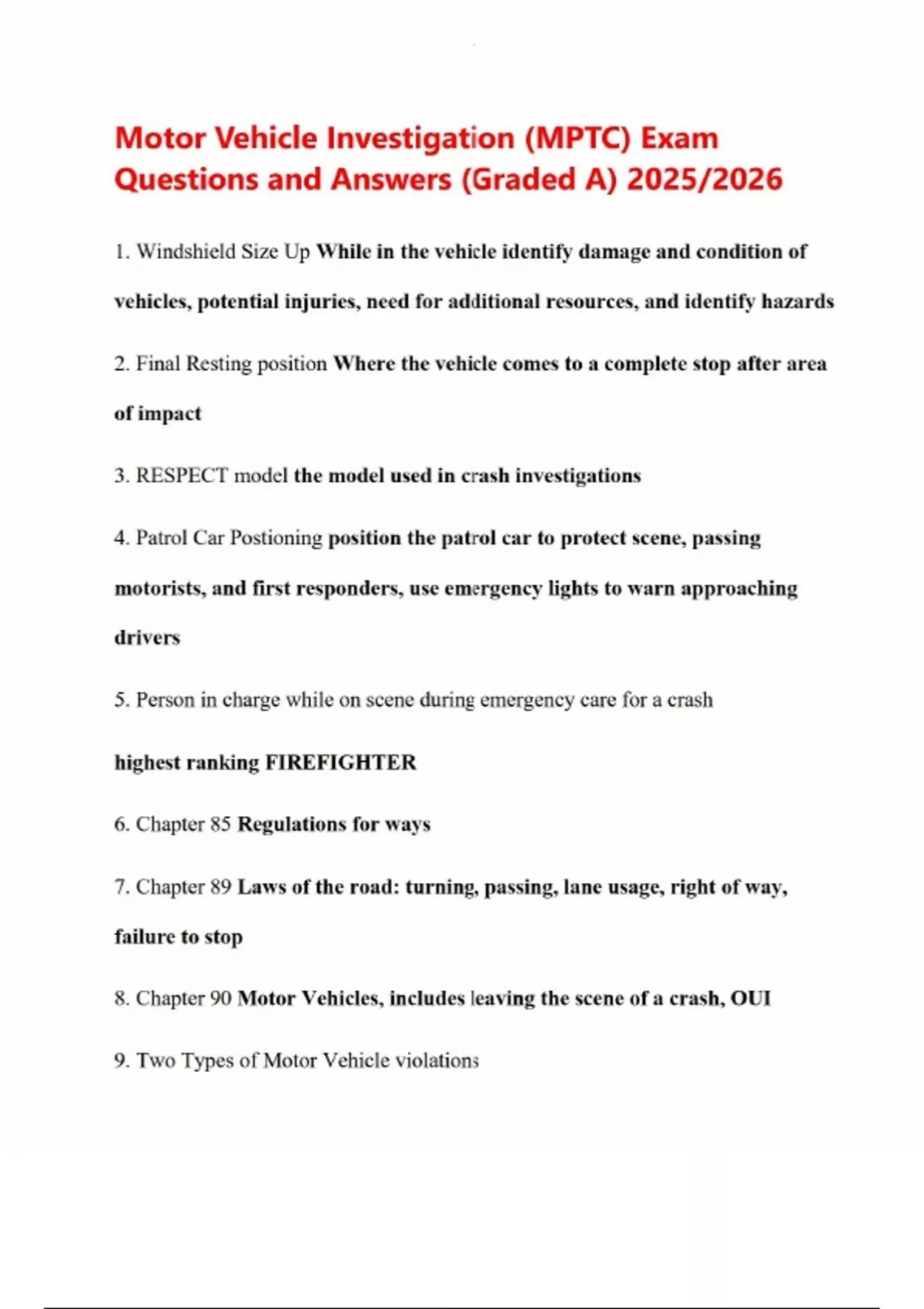 Motor Vehicle Investigation (MPTC) Exam Questions and Answers (Graded A) 2025/2026 1. Windshield Size Up While in the vehicle identify damage and condition of vehicles, potential injuries, need for additional resources, and identify hazards 2. Final Resting position Where the vehicle comes to a complete stop after area of impact 3. RESPECT model the model used in crash investigations 4. Patrol Car Postioning position the patrol car to protect scene, passing motorists, and first responders, use emergency lights to warn approaching drivers 5. Person in charge while on scene during emergency care for a crash highest ranking FIREFIGHTER 6. Chapter 85 Regulations for ways 7. Chapter 89 Laws of the road: turning, passing, lane usage, right of way, failure to stop 8. Chapter 90 Motor Vehicles, includes leaving the scene of a crash, OUI 9. Two Types of Motor Vehicle violations
