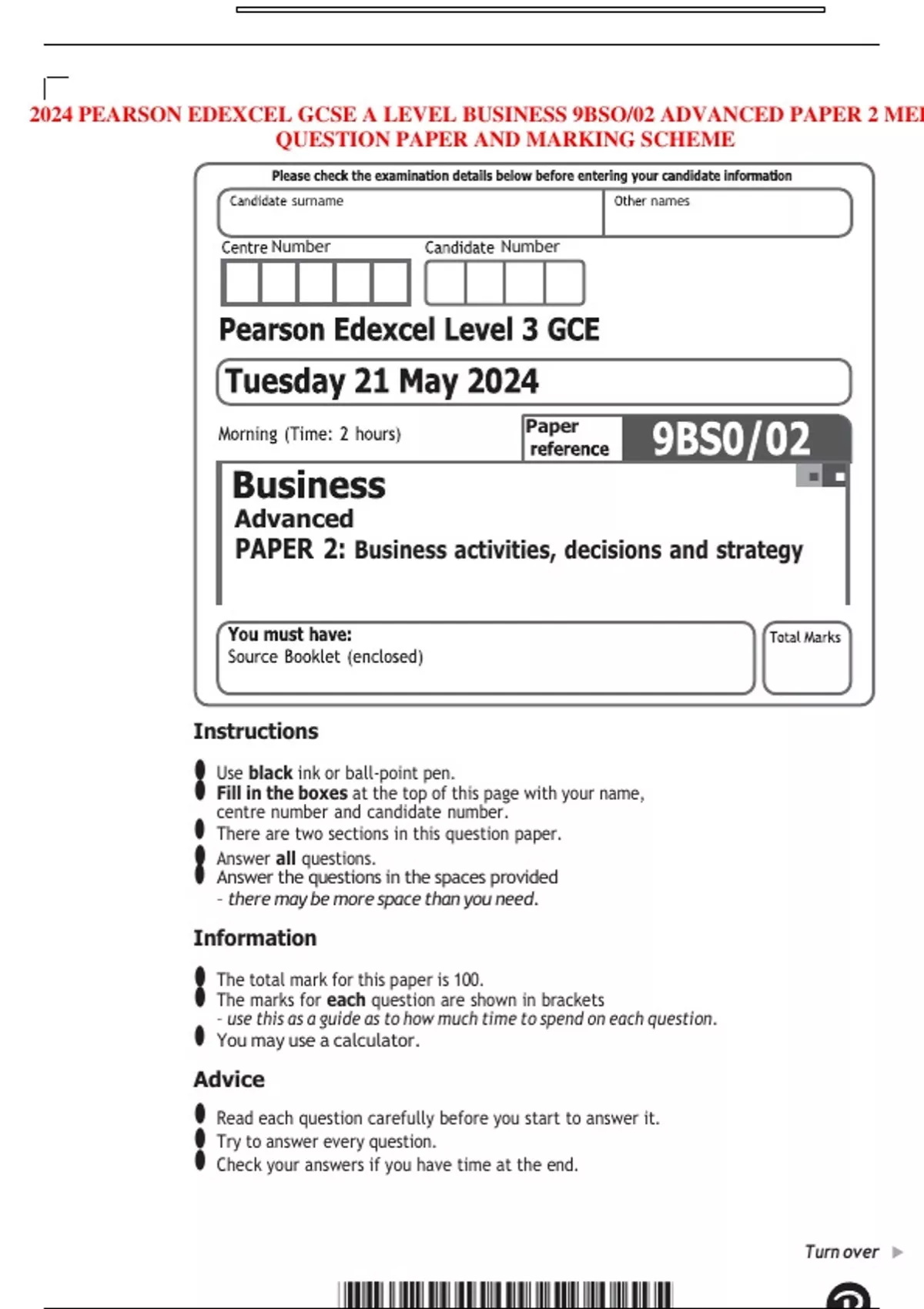 2024 PEARSON EDEXCEL GCSE A LEVEL BUSINESS 9BSO/02 ADVANCED PAPER 2 MER