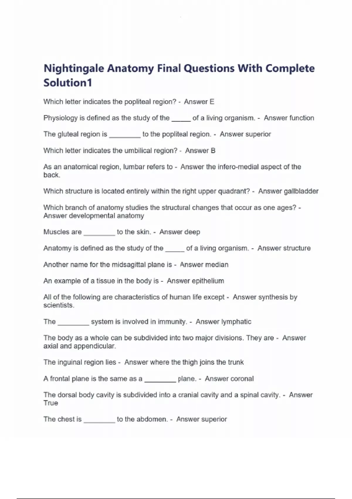 Nightingale Anatomy Final Questions With Complete Solution1 Which letter indicates the popliteal region? - Answer E Physiology is defined as the study of the _____ of a living organism. - Answer function The gluteal region is ________ to the popliteal region. - Answer superior Which letter indicates the umbilical region? - Answer B As an anatomical region, lumbar refers to - Answer the infero-medial aspect of the back. Which structure is located entirely within the right upper quadrant? - Answer gallbladder Which branch of anatomy studies the structural changes that occur as one ages? - Answer developmental anatomy Muscles are ________ to the skin. - Answer deep Anatomy is defined as the study of the _____ of a living organism. - Answer structure Another name for the midsagittal plane is - Answer median An example of a tissue in the body is - Answer epithelium All of the following are characteristics of human life except - Answer synthesis by scientists. The ________ system is involved in immunity. - Answer lymphatic The body as a whole can be subdivided into two major divisions. They are - Answer axial and appendicular. The inguinal region lies - Answer where the thigh joins the trunk A frontal plane is the same as a ________ plane. - Answer coronal The dorsal body cavity is subdivided into a cranial cavity and a spinal cavity. - Answer True The chest is ________ to the abdomen. - Answer superior