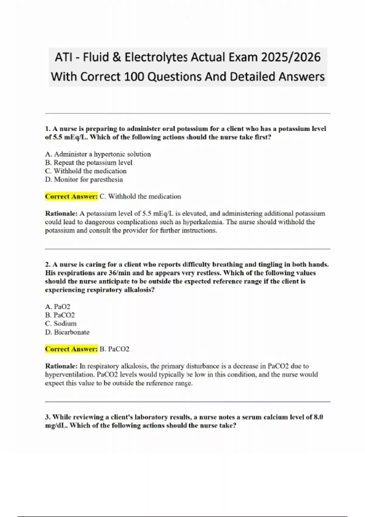 ATI - Fluid & Electrolytes Actual Exam 2025/2026 With Correct 100 Questions And Detailed Answers a nursing assessment test provided by the ATI (Assessment Technologies Institute) that focuses on a student's knowledge and understanding of fluid and electrolyte balance in the human body, including identifying signs of imbalances, managing related patient care, and interpreting laboratory results related to electrolytes like sodium, potassium, and calcium.