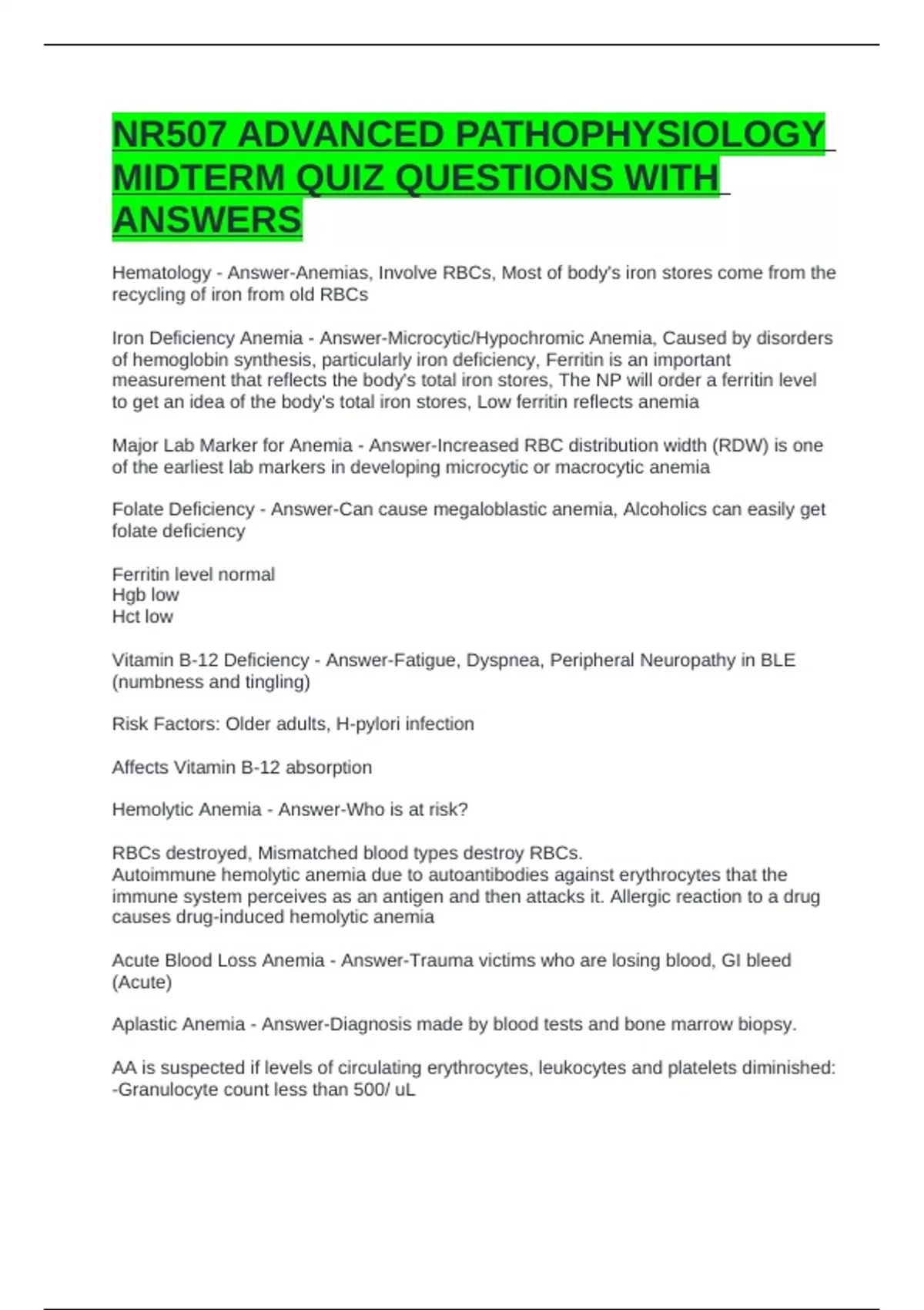 Major Lab Marker for Anemia - Answer-Increased RBC distribution width (RDW) is one