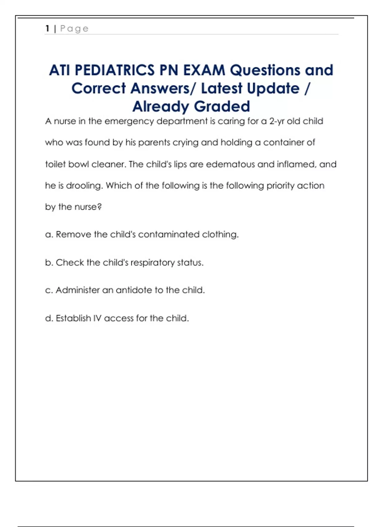 A nurse in the emergency department is caring for a 2-yr old child who was found by his parents crying and holding a container of toilet bowl cleaner. The child's lips are edematous and inflamed, and he is drooling. Which of the following is the following priority action by the nurse? a. Remove the child's contaminated clothing. b. Check the child's respiratory status. c. Administer an antidote to the child. d. Establish IV access for the child. 2 | Page Ans: b. Check the child's respiratory status. Rationale: When applying the ABC priority setting framework, airway is always the highest priority because the airway must be clear and open for oxygen exchange to occur. Breathing is the second highest priority in the ABC priority setting framework because adequate ventilatory effort is essential in order for oxygen change to occur. A nurse is teaching a parent of a 12-month old child about development during the toddler years. Which of the following statements should the nurse include? a. Your child should be referring to himself using the appropriate pronoun by the 18 months of age b. a toddler's interest in looking at pictures occurs at 20 months of age c. a toddler should have daytime control of his bowel and bladder by 24 months of age. d. your child should be able to scribble spontaneously using a crayon at the age of 15 months 3 | Page Ans: d. your child sho