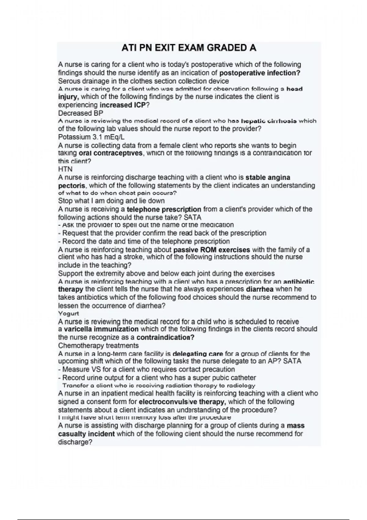 A nurse is caring for a client who is today's postoperative which of the following findings should the nurse identify as an indication of postoperative infection? Serous drainage in the clothes section collection device A nurse is caring for a client who was admitted for observation following a head injury, which of the following findings by the nurse indicates the client is experiencing increased ICP? Decreased BP A nurse is reviewing the medical record of a client who has hepatic cirrhosis which of the following lab values should the nurse report to the provider? Potassium 3.1 mEq/L A nurse is collecting data from a female client who reports she wants to begin taking oral contraceptives, which of the following findings is a contraindication for this client? HTN A nurse is reinforcing discharge teaching with a client who is stable angina pectoris, which of the following statements by the client indicates an understanding of what to do when chest pain occurs? Stop what I am doing and lie down A nurse is receiving a telephone prescription from a client's provider which of the following actions should the nurse take? SATA - Ask the provider to spell out the name of the medication - Request that the provider confirm the read back of the prescription - Record the date and time of the telephone prescription A nurse is reinforcing teaching about passive ROM exercises with the family of a client who has had a stroke, which of the following instructions should the nurse include in the teaching? Support the extremity above and below each joint during the exercises A nurse is reinforcing teaching with a client who has a prescription for an antibiotic therapy the client tells the nurse that he always experiences diarrhea when he takes antibiotics which of the following food choices should the nurse recommend to lessen the occurrence of diarrhea? Yogurt A nurse is reviewing the medical record for a child who is scheduled to receive a varicella immunization which of the following findings in the clients record should the nurse recognize as a contraindication? Chemotherapy treatments A nurse in a long-term care facility is delegating care for a group of clients for the upcoming shift which of the following tasks the nurse delegate to an AP? SATA - Measure VS for a client who requires contact precaution - Record urine output for a client who has a super pubic catheter - Transfer a client who is receiving radiation therapy to radiology A nurse in an inpatient medical health facility is reinforcing teaching with a client who signed a consent form for electroconvulsive therapy, which of the following statements about a client indicates an understanding of the procedure? I might have short term memory loss after the procedure A nurse is assisting with discharge planning for a group of clients during a mass casualty incident which of the following client should the nurse recommend for discharge? A client who had DKA and has a blood glucose level of 120 mg/dL A nurse is caring for a client who is postoperative following a subtotal thyroidectomy the nurse should place the client in which of the following positions? Semi Fowler's A nurse is discussing the plan of care of a client who is four hours postoperative and has a urostomy with an AP which of the following statements should the nurse include in the discussion? We need to check the clients urine output every hour A nurse is collecting data from a client who has heart failure the nurse notices the client has crackles in the bases of the lungs, SOB and a RR of 24 bpm, which of the following actions should the nurse take? Maintain the client in high Fowlers position A nurse is preparing to administer 0.9% sodium chloride 250 mL IV to infuse over 30 minutes to a client the nurse just set the IV pump to deliver how many milliliters per hour? 500 mL/hr A nurse is collecting data from a client who has a UTI and is taking Ciprofloxacin. The client reports pain in her calf muscle ,which of the following statements should the nurse make? Discontinue the medication I will ask your provider for another antibiotic A home health nurse is conducting a home inspection for a client who is at risk for falls, which of the following instruction should the nurse provide for the client? Move the clients bed to the main floor on the house A nurse in an acute mental health facility is caring for an adolescent who is exhibiting destructive behavior which of the following actions should the nurse take after applying physical restraints to the client? Plan to remove the restraints as soon as the client is calm A nurse is caring in the client's respirations and notes they are of average heart rate is 24 bpm and the rhythm is regular which of the following alterations in the clients breathing pattern should the nurse continue to monitor? Tachypnea A nurse manager is a system with the negotiation between to charge nurses were having a conflict over staff not completing assignments which of the following actions should the nurse manager take? Establish ground rules before beginning discussion between the charge nurses A nurse is caring for a client who is receiving intermittent external feeding and he has diarrhea which of the following actions should the nurse take? Deliver a smaller amount of formula more frequently A nurse is feeding a client who had a stroke resulting in left side of weakness which of the following actions should the nurse take? Encourage the client to drink a small amount of liquids to clear his mouth of food A nurse is caring for a client who is taking furosemide which of the following affects should the nurse monitor? Hypokalemia A nurse is reinforcing teaching with a client who has a UTI which of the following instruction should the nurse include in the teaching? Wear cotton underwear A nurse is reinforcing dietary teaching with a client who's pre-pregnancy BMI was 30.5 the nurse should recognize that the client understands the teaching when she states she sho