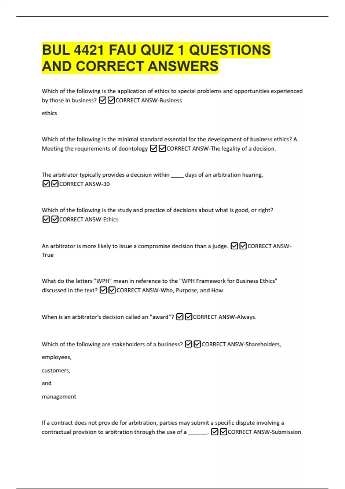 BUL 4421 FAU QUIZ 1 QUESTIONS AND CORRECT ANSWERS Which of the following is the application of ethics to special problems and opportunities experienced by those in business? CORRECT ANSW-Business ethics Which of the following is the minimal standard essential for the development of business ethics? A. Meeting the requirements of deontology CORRECT ANSW-The legality of a decision. The arbitrator typically provides a decision within ____ days of an arbitration hearing. CORRECT ANSW-30 Which of the following is the study and practice of decisions about what is good, or right? CORRECT ANSW-Ethics