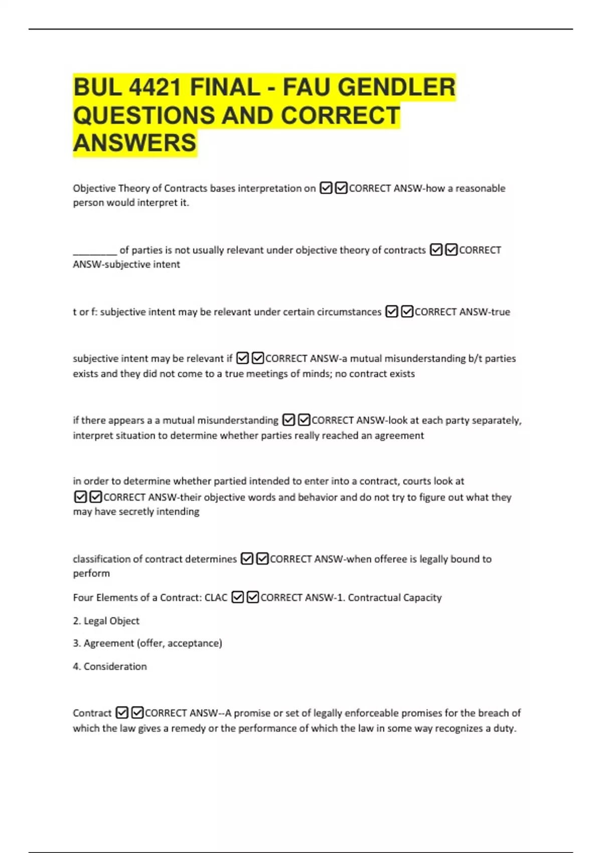 Four Elements of a Contract: CLAC ✅✅CORRECT ANSW-1. Contractual Capacity