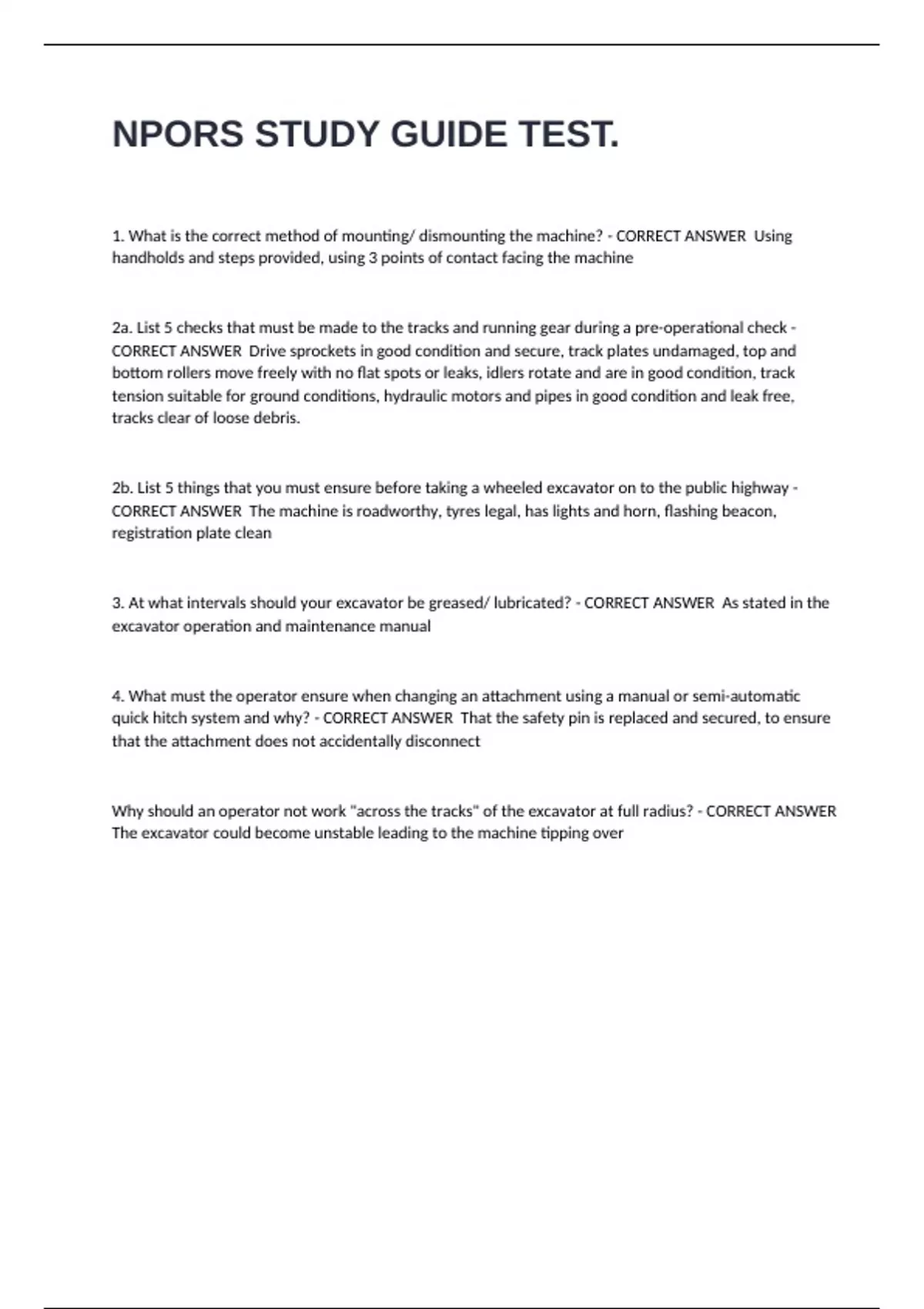 NPORS STUDY GUIDE TEST. 1. What is the correct method of mounting/ dismounting the machine? - CORRECT ANSWER Using handholds and steps provided, using 3 points of contact facing the machine 2a. List 5 checks that must be made to the tracks and running gear during a pre-operational check - CORRECT ANSWER Drive sprockets in good condition and secure, track plates undamaged, top and bottom rollers move freely with no flat spots or leaks, idlers rotate and are in good condition, track tension suitable for ground conditions, hydraulic motors and pipes in good condition and leak free, tracks clear of loose debris.