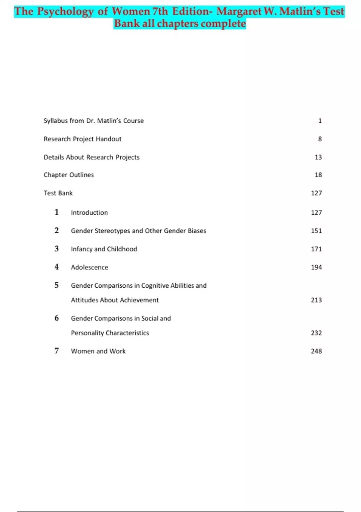 The Psychology of Women 7th Edition- Margaret W. Matlin’s Test Bank all chapters completeThe Psychology of Women 7th Edition- Margaret W. Matlin’s Test Bank all chapters completeThe Psychology of Women 7th Edition- Margaret W. Matlin’s Test Bank all chapters completeThe Psychology of Women 7th Edition- Margaret W. Matlin’s Test Bank all chapters completeThe Psychology of Women 7th Edition- Margaret W. Matlin’s Test Bank all chapters completeThe Psychology of Women 7th Edition- Margaret W. Matlin’s Test Bank The Psychology of Women 7th Edition- Margaret W. Matlin’s Test Bank Syllabus from Dr. Matlin’s Course 1 Research Project Handout 8 Details About Research Projects 13 Chapter Outlines 18 Test Bank 127 1 Introduction 127 2 Gender Stereotypes and Other Gender Biases 151 3 Infancy and Childhood 171 4 Adolescence 194 5 Gender Comparisons in Cognitive Abilities and Attitudes About Achievement 6 7 213 Gender Comparisons in Social and Personality Characteristics 232 Women and Work 248 The Psychology of Women 7th Edition- Margaret W. Matlin’s Test Bank The Psychology of Women 7th Edition- Margaret W. Matlin’s Test Bank 8 Love Relationships 269 9 Sexuality 288 10 Pregnancy, Childbirth, and Motherhood 307 11 Women and Physical Health 324 12 Women and Psychological Health 343 13 Violence Against Women 361 14 Women and Older Adulthood 378 15 Moving Onward . . . 395 The Psychology of Women 7th Edition- Margaret W. Matlin’s Test Bank The Psychology of Women 7th Edition- Margaret W. Matlin’s Test Bank SYLLABUS FROM DR. MARGARET W. MATLIN’S COURSE My syllabus changes somewhat from one semester to the next, but the syllabus below is the version I used in Fall Semester, 2010. (However, the textbook for that course was the 6th edition.)I think it’s important for a syllabus to include a brief description of the course, as well as the goals. From the first ...