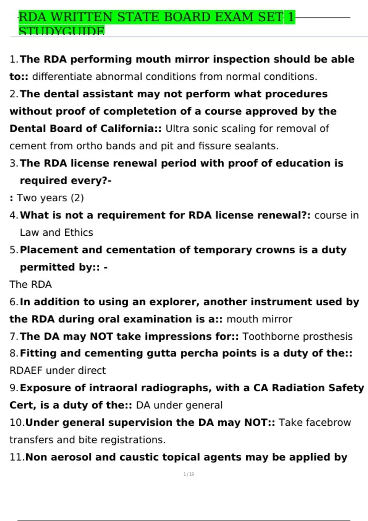 RDA WRITTEN STATE BOARD EXAM SET 1 STUDYGUIDE