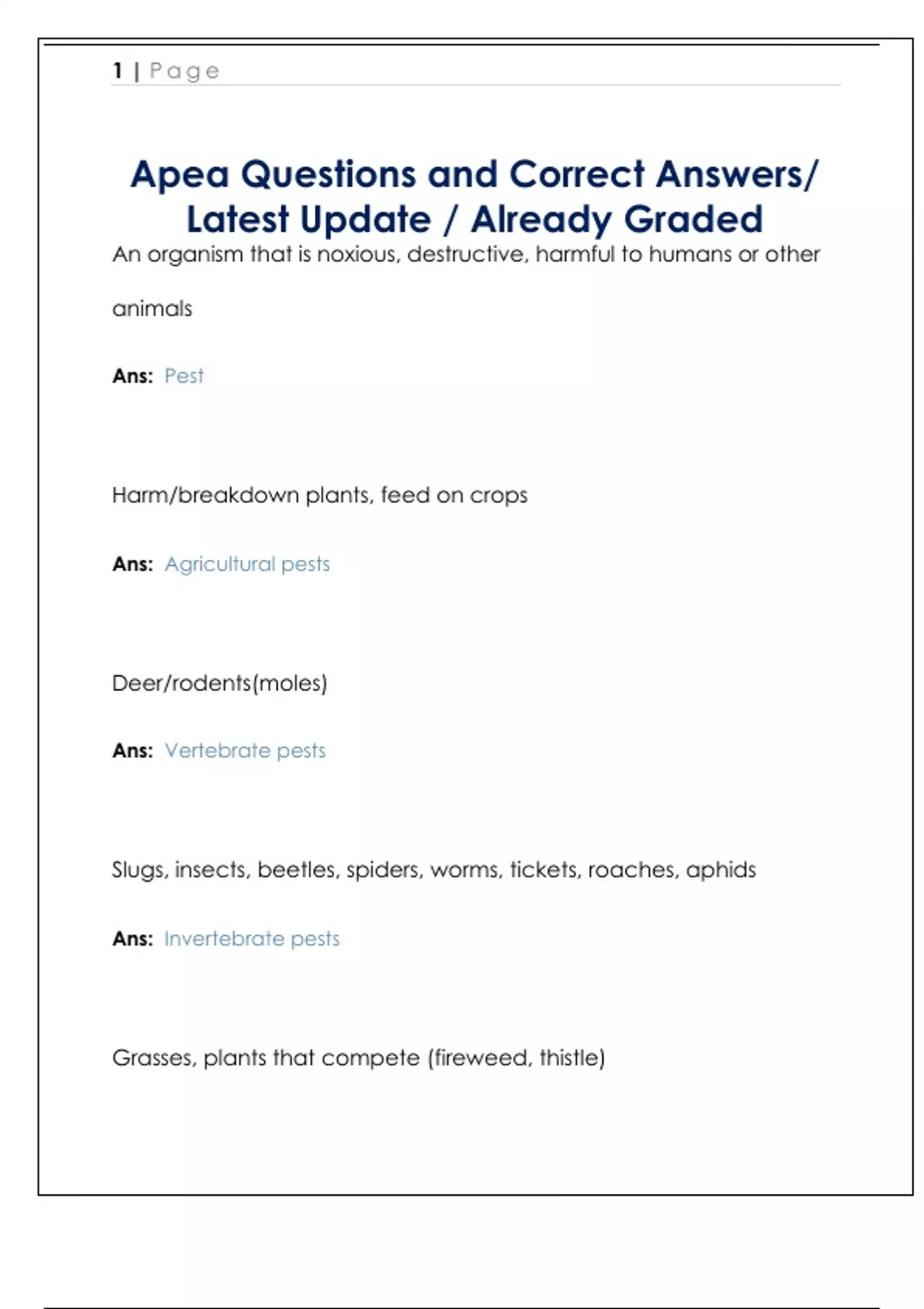 An organism that is noxious, destructive, harmful to humans or other animals Ans: Pest Harm/breakdown plants, feed on crops Ans: Agricultural pests Deer/rodents(moles) Ans: Vertebrate pests Slugs, insects, beetles, spiders, worms, tickets, roaches, aphids Ans: Invertebrate pests Grasses, plants that compete (fireweed, thistle) 2 | Page Ans: Weed pests Bacteria, fungus, virus Ans: Microbial pests Kill weeds/plants Ans: Herbicides Kill insecta Ans: Insecticide Kill fungus Ans: Fungicides Kills rodents