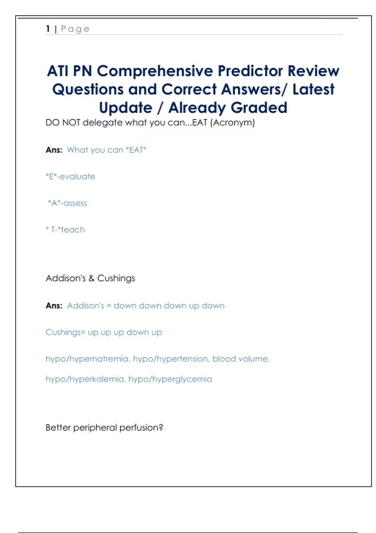 DO NOT delegate what you can...EAT (Acronym) Ans: What you can *EAT* *E*-evaluate *A*-assess * T-*teach Addison's & Cushings Ans: Addison's = down down down up down Cushings= up up up down up hypo/hypernatremia, hypo/hypertension, blood volume, hypo/hyperkalemia, hypo/hyperglycemia Better peripheral perfusion? 2 | Page Ans: Elevate veins, D-Angle Arteries APGAR Ans: Appearance (all pink, pink and blue, blue (pale) Pulse (>100, <100, absent) Grimace (cough, grimace, no response) Activity (flexed, flaccid, limp) Respirations (strong cry, weak cry, absent) Airborne precautions Ans: MTV or My chicken hez tb measles, chickenpox (varicella) Herpes zoster/shingles TB Airborne precautions protective equip Ans: private room, neg pressure with 6-12 air exchanges/hr mask & respirator N95 for TB