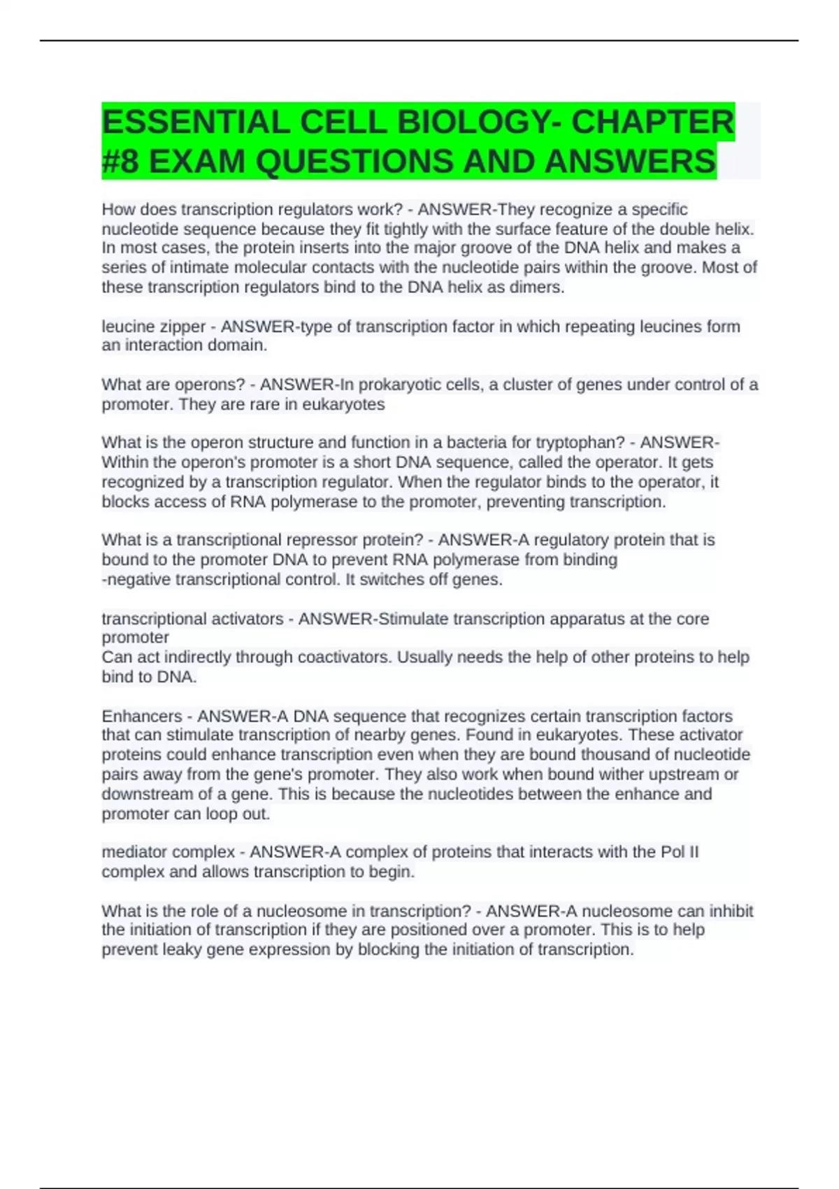 ESSENTIAL CELL BIOLOGY- CHAPTER #8 EXAM QUESTIONS AND ANSWERS