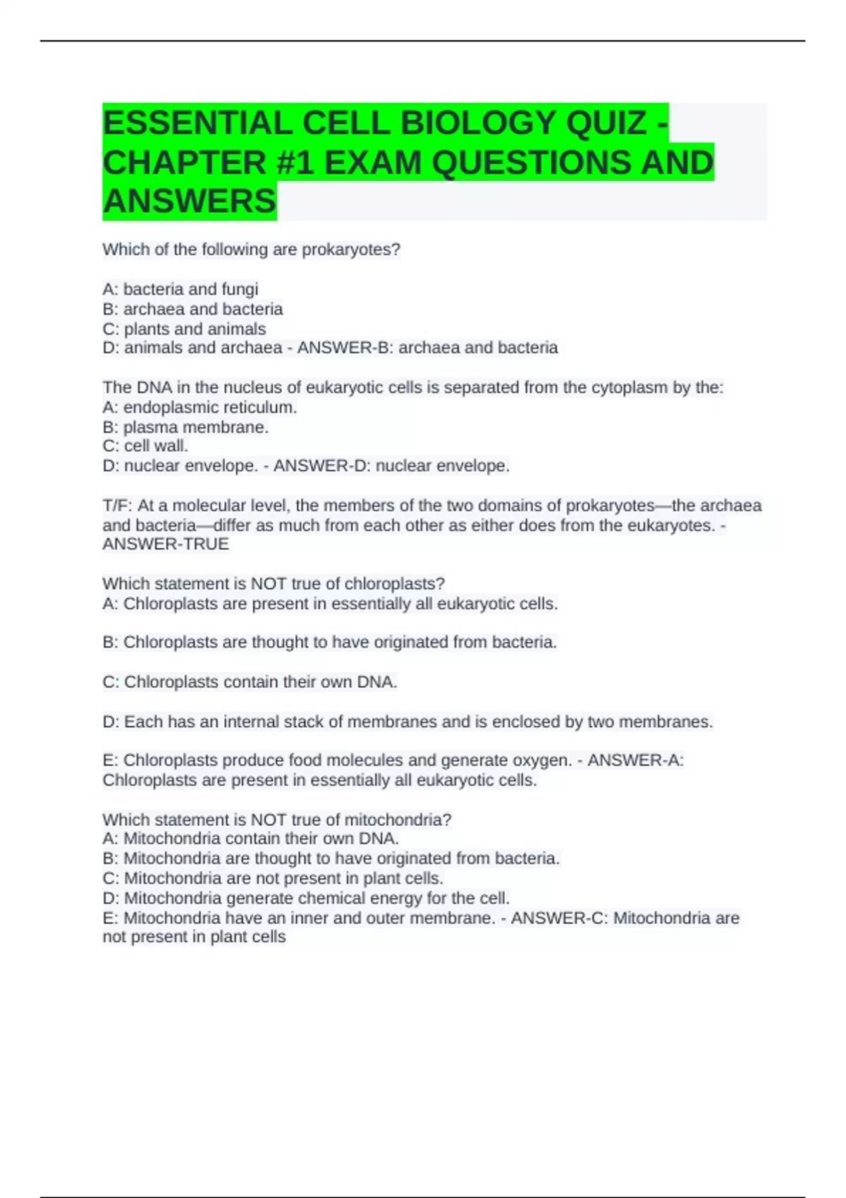ESSENTIAL CELL BIOLOGY QUIZ - CHAPTER #1 EXAM QUESTIONS AND ANSWERS