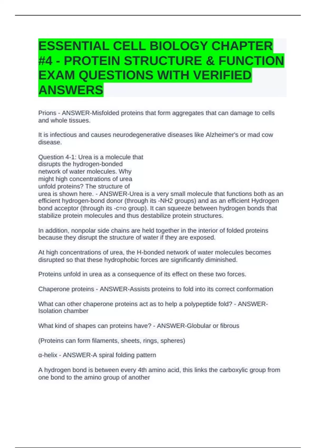 ESSENTIAL CELL BIOLOGY CHAPTER #4 - PROTEIN STRUCTURE & FUNCTION EXAM QUESTIONS WITH VERIFIED ANSWERS