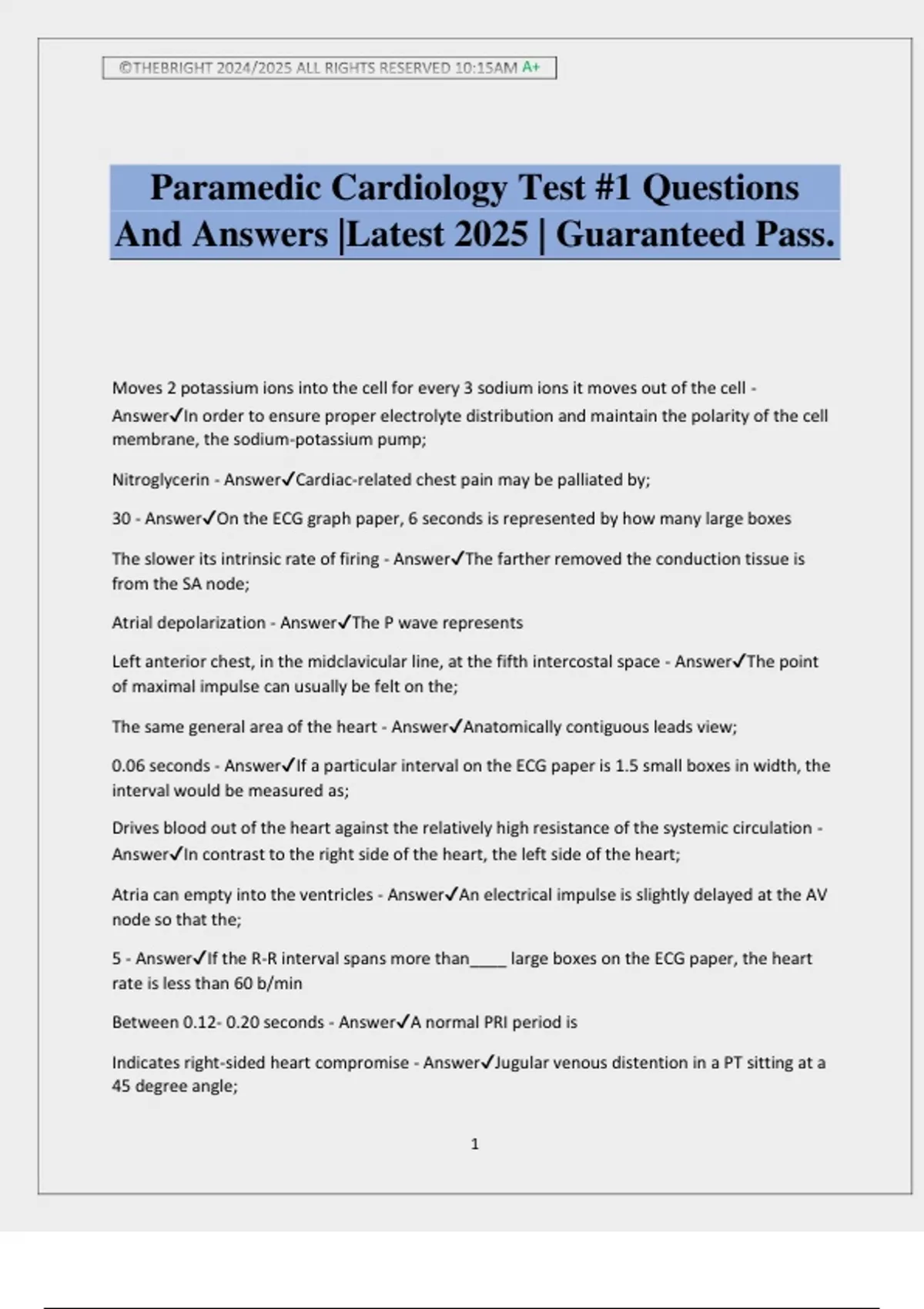 Paramedic Cardiology Test #1 Questions