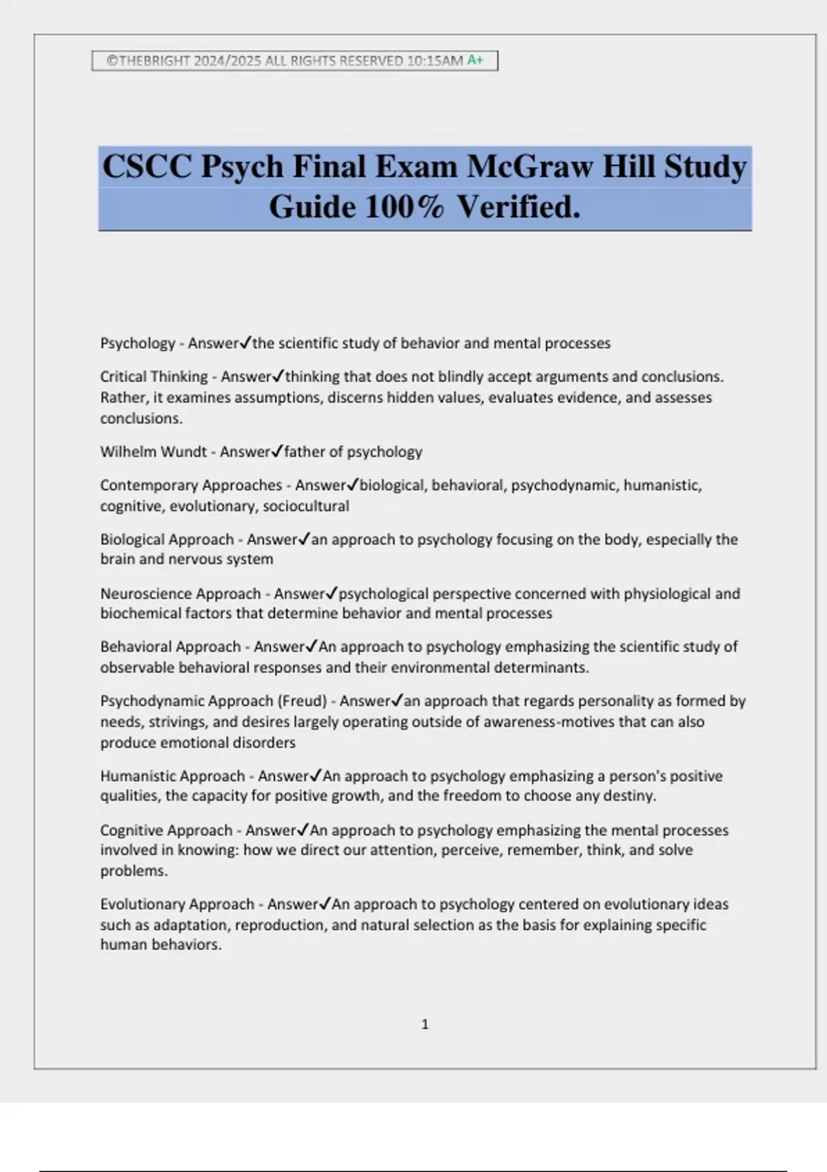 Psychology - Answer✔the scientific study of behavior and mental processes