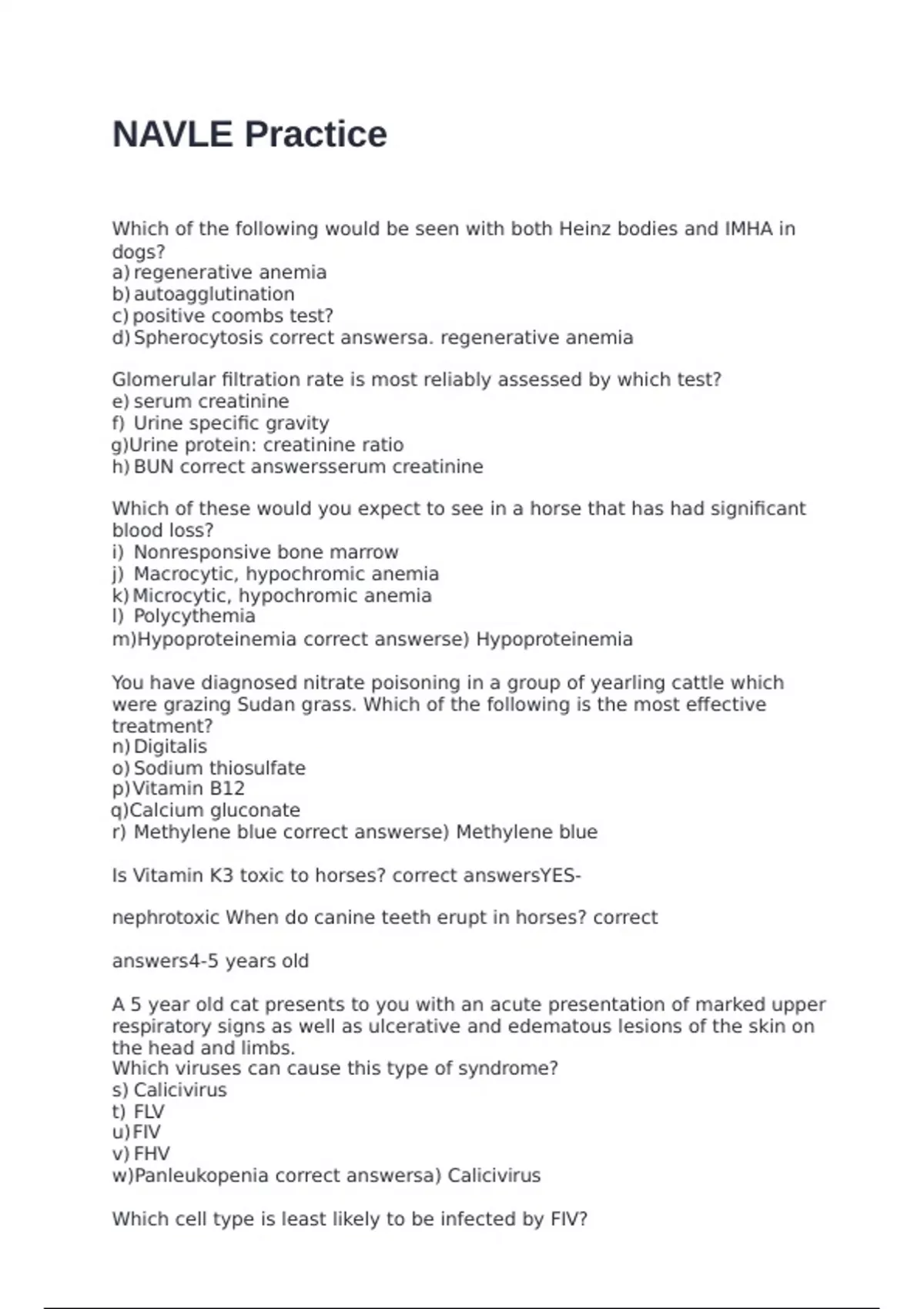 Which of the following would be seen with both Heinz bodies and IMHA in dogs? a) regenerative anemia b) autoagglutination c) positive coombs test? d) Spherocytosis correct answersa. regenerative anemia Glomerular filtration rate is most reliably assessed by which test? a) serum creatinine b) Urine specific gravity c)Urine protein: creatinine ratio d) BUN correct answersserum creatinine Which of these would you expect to see in a horse that has had significant blood loss? a) Nonresponsive bone marrow b) Macrocytic, hypochromic anemia c) Microcytic, hypochromic anemia d) Polycythemia e) Hypoproteinemia correct answerse) Hypoproteinemia You have diagnosed nitrate poisoning in a group of yearling cattle which were grazing Sudan grass. Which of the following is the most effective treatment? a) Digitalis b) Sodium thiosulfate c) Vitamin B12 d)Calcium gluconate e) Methylene blue correct answerse) Methylene blue Is Vitamin K3 toxic to horses? correct answersYES- nephrotoxic When do canine teeth erupt in horses? correct answers4-5 years old A 5 year old cat presents to you with an acute presentation of marked upper respiratory signs as well as ulcerative and edematous lesions of the skin on the head and limbs. Which viruses can cause this type of syndrome? a) Calicivirus b) FLV c) FIV d) FHV e) Panleukopenia correct answersa) Calicivirus Which cell type is least likely to be infected