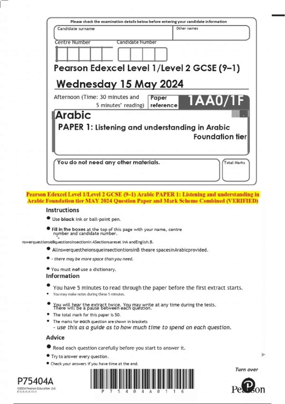 Pearson Edexcel Level 1/Level 2 GCSE (9–1) Arabic PAPER 1: Listening and understanding in Arabic Foundation tier MAY Question Paper and Mark Scheme MERGED