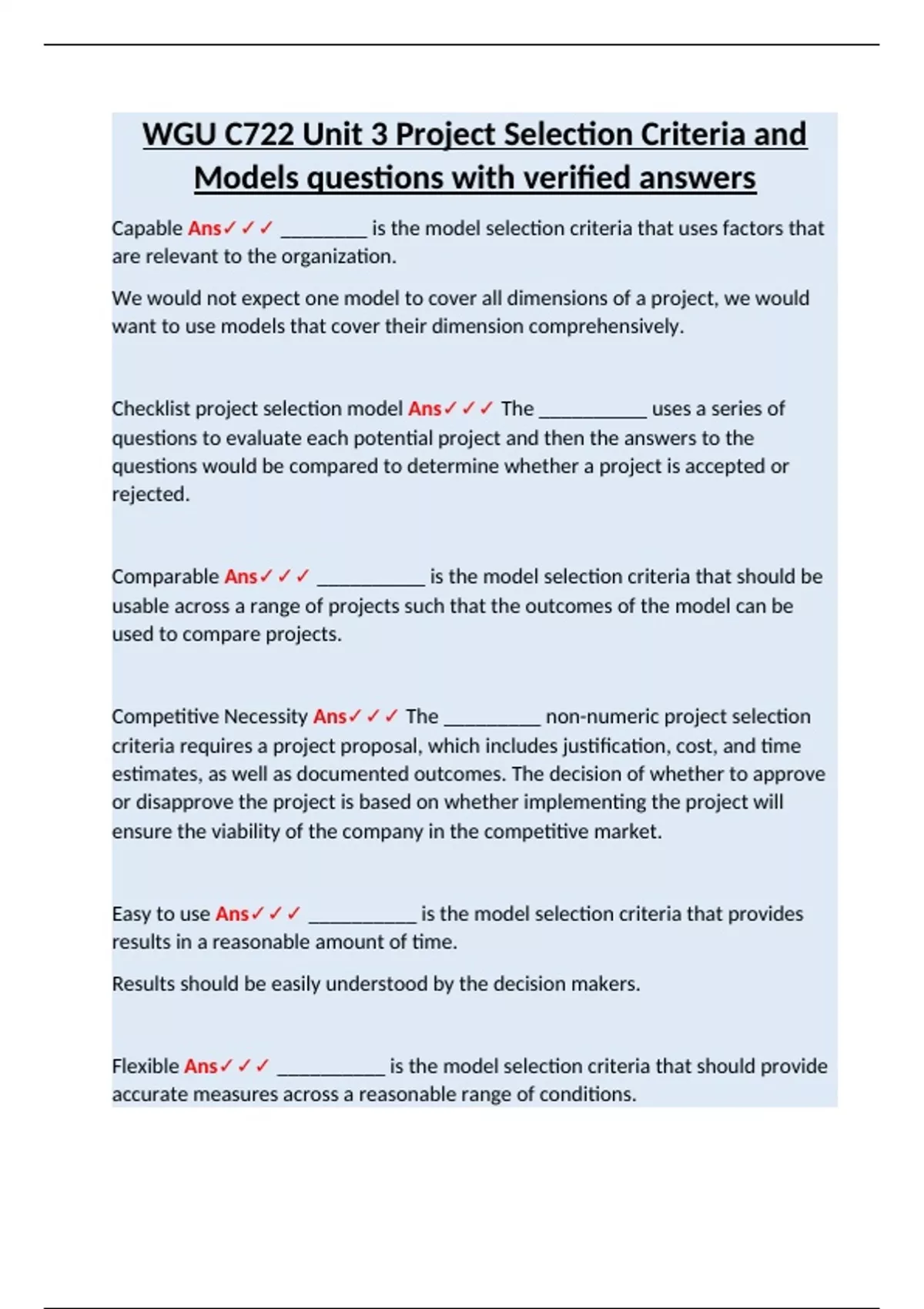 Checklist project selection model Ans✓✓✓ The __________ uses a series of