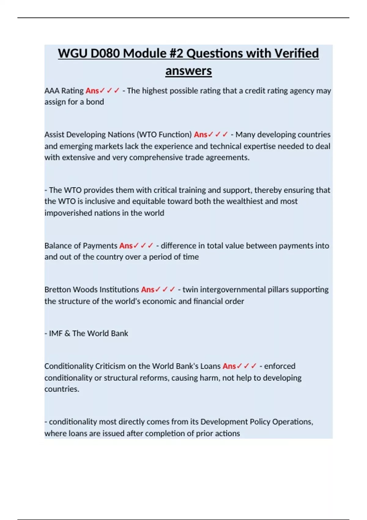 AAA Rating Ans - The highest possible rating that a credit rating agency may assign for a bond Assist Developing Nations (WTO Function) Ans - Many developing countries and emerging markets lack the experience and technical expertise needed to deal with extensive and very comprehensive trade agreements. - The WTO provides them with critical training and support, thereby ensuring that the WTO is inclusive and equitable toward both the wealthiest and most impoverished nations in the world Balance of Payments Ans - difference in total value between payments into and out of the country over a period of time Bretton Woods Institutions Ans - twin intergovernmental pillars supporting the structure of the world's economic and financial order - IMF & The World Bank