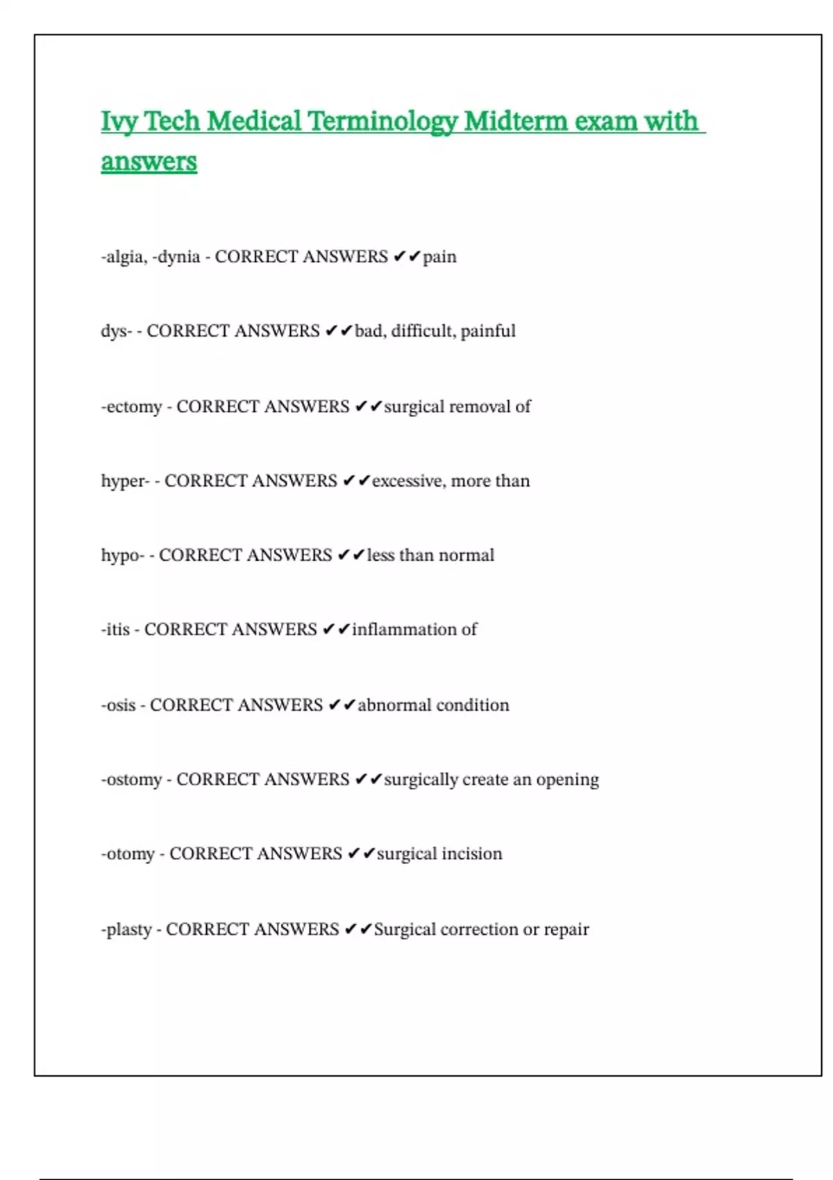 Ivy Tech Medical Terminology Midterm exam with answers