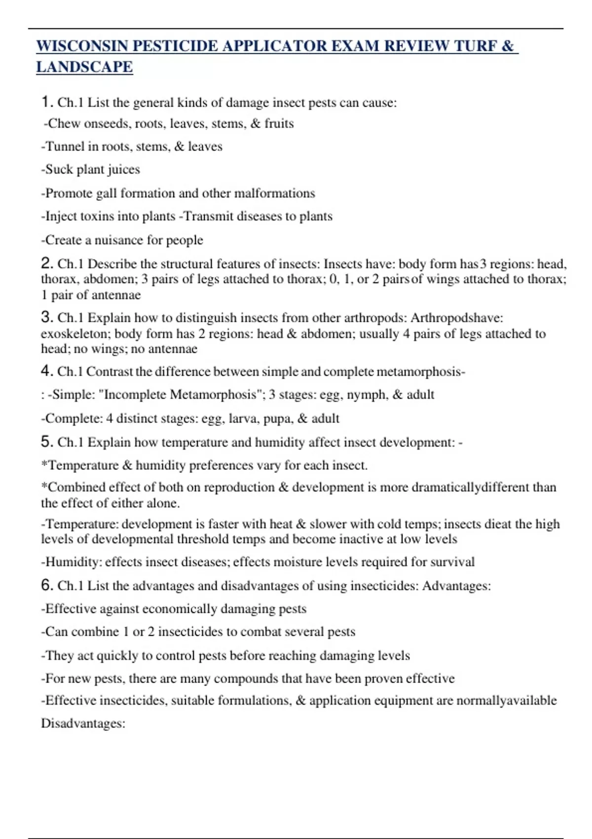 6. Ch.1 List the advantages and disadvantages of using insecticides: Advantages: