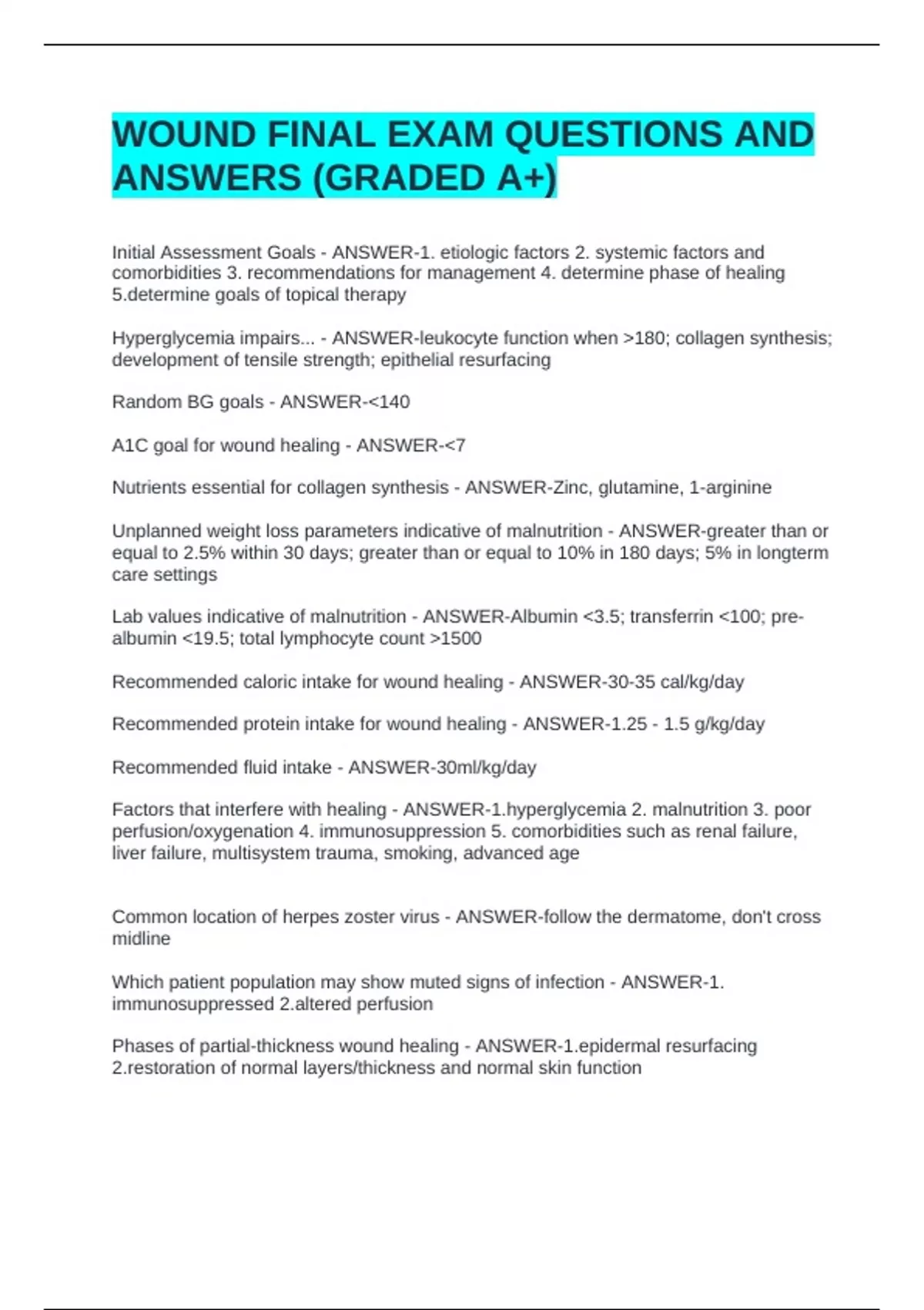 Hyperglycemia impairs... - ANSWER-leukocyte function when >180; collagen synthesis;
