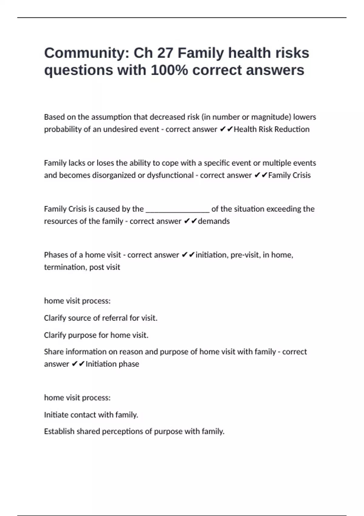 Phases of a home visit - correct answer ✔✔initiation, pre-visit, in home,