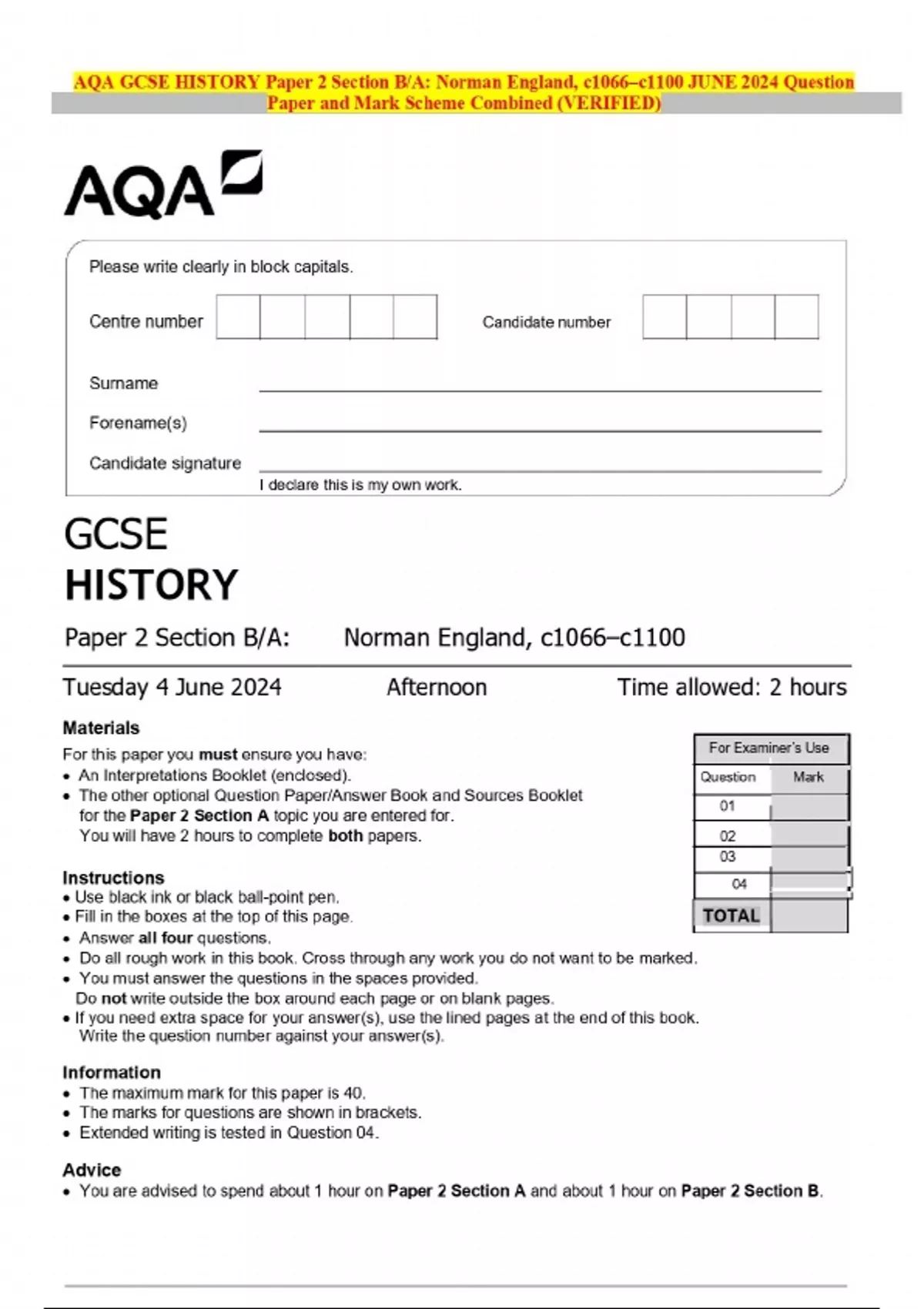 2024 AQA GCSE HISTORY Paper 2 Section B/A: Norman England, c1066–c1100 JUNE Question Paper and Mark Scheme MERGED
