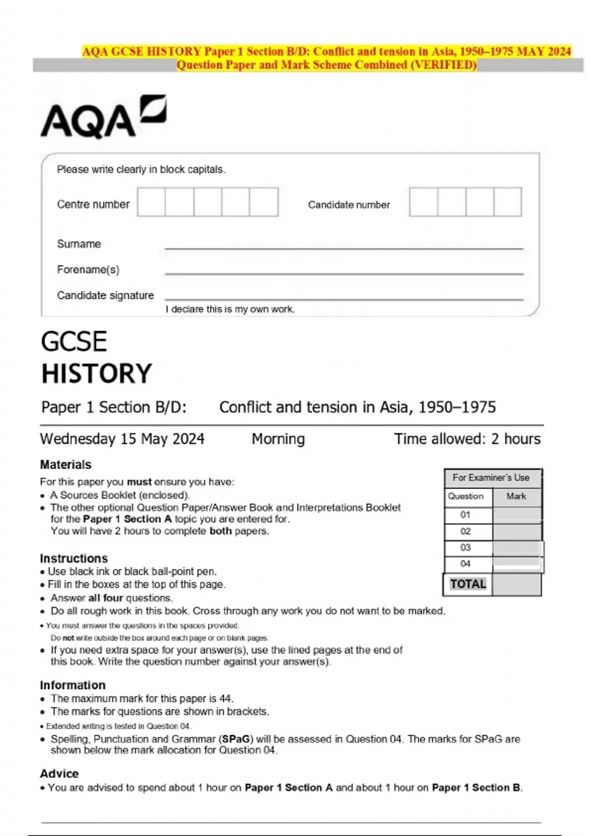 2024 AQA GCSE HISTORY Paper 1 Section B/D: Conflict and tension in Asia, 1950–1975 MAY Question Paper and Mark Scheme MERGED
