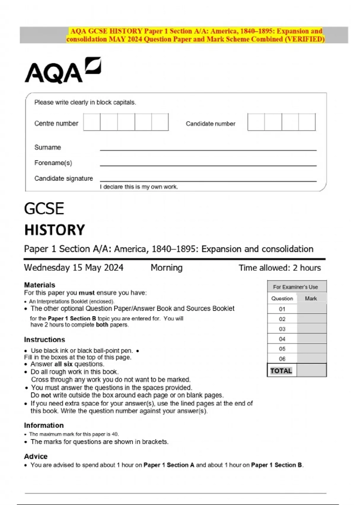 2024 AQA GCSE HISTORY Paper 1 Section A/A: America, 1840–1895: Expansion and consolidation MAY Question Paper and Mark Scheme MERGED